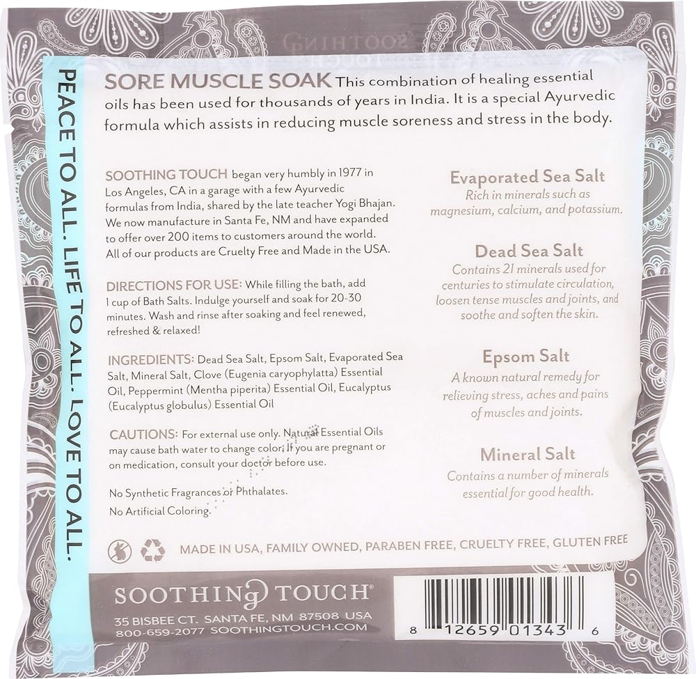 Soothing Touch tension relief sore muscle soak bath salts eucalyptus clove and peppermint, This bath Salt contains Dead Sea salt, Evaporated Sea Salt, Mineral Salts, Epsom Salt and Essential oils. This essential oil blend can be used for relief after strenuous exercise or just to ease muscle Tensions. Rich in minerals such as magnesium, calcium and potassium. No synthetic fragrances or phthalates. No artificial coloring. Paraben, Cruelty and gluten free.