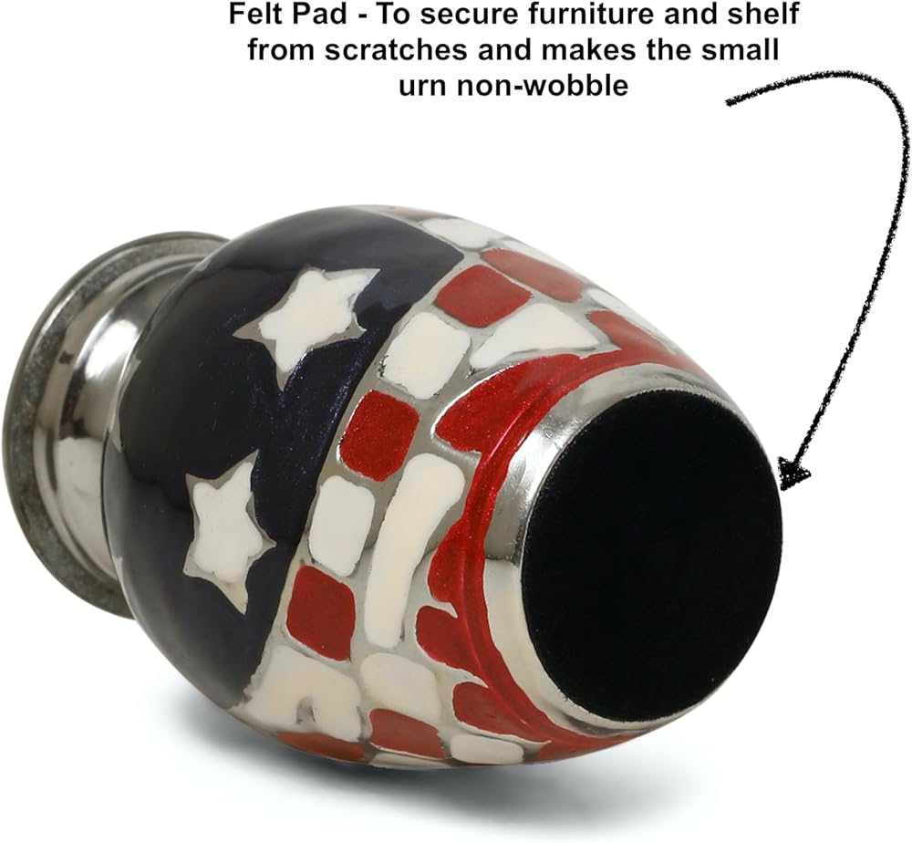 ♥ OVERALL FINISH AND COLOUR: The Funeral Cremation Urns For Human Remains are made of Solid Brass Metal using Sand Cast Technique. The Mini Urn is painted with Red, White and Blue colour in beautiful American Flag pattern by experienced artisans in India. Vials for Memorial Ashes is having great blue colour combination.