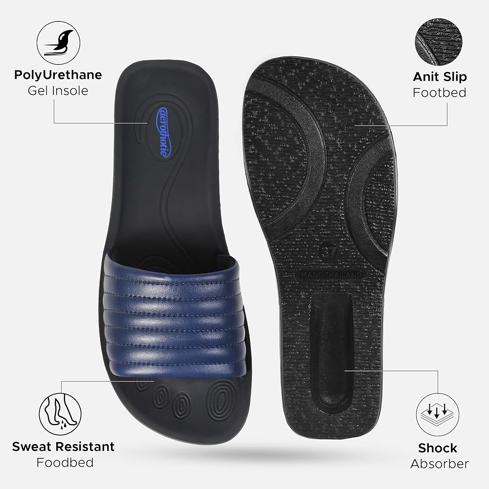 Comfort & style: The fine stitching on womens slides upper assures a look of perfection to your feet. Otis soft cushioning inside, and unique style outside outshines the ordinary look, while the gold metallic buckle makes the exterior more prominent. The polyurethane gel injected technology adds a bounce to your step.