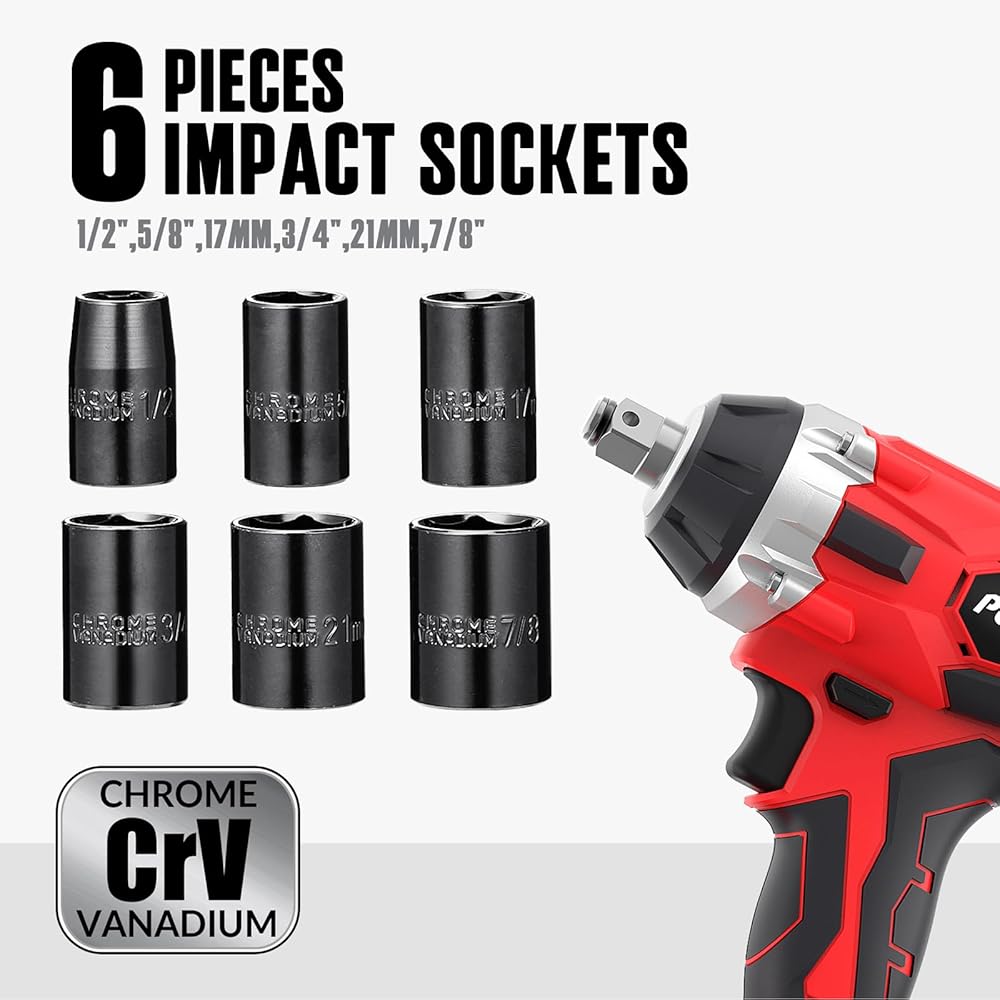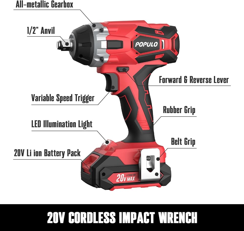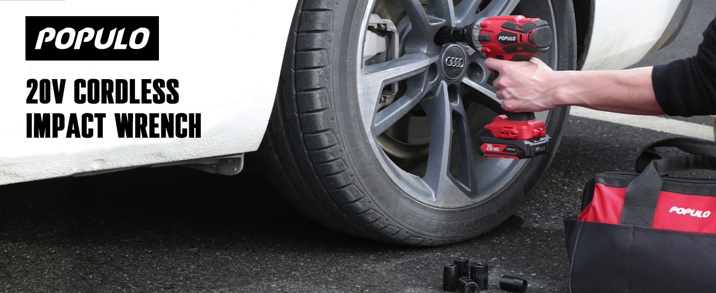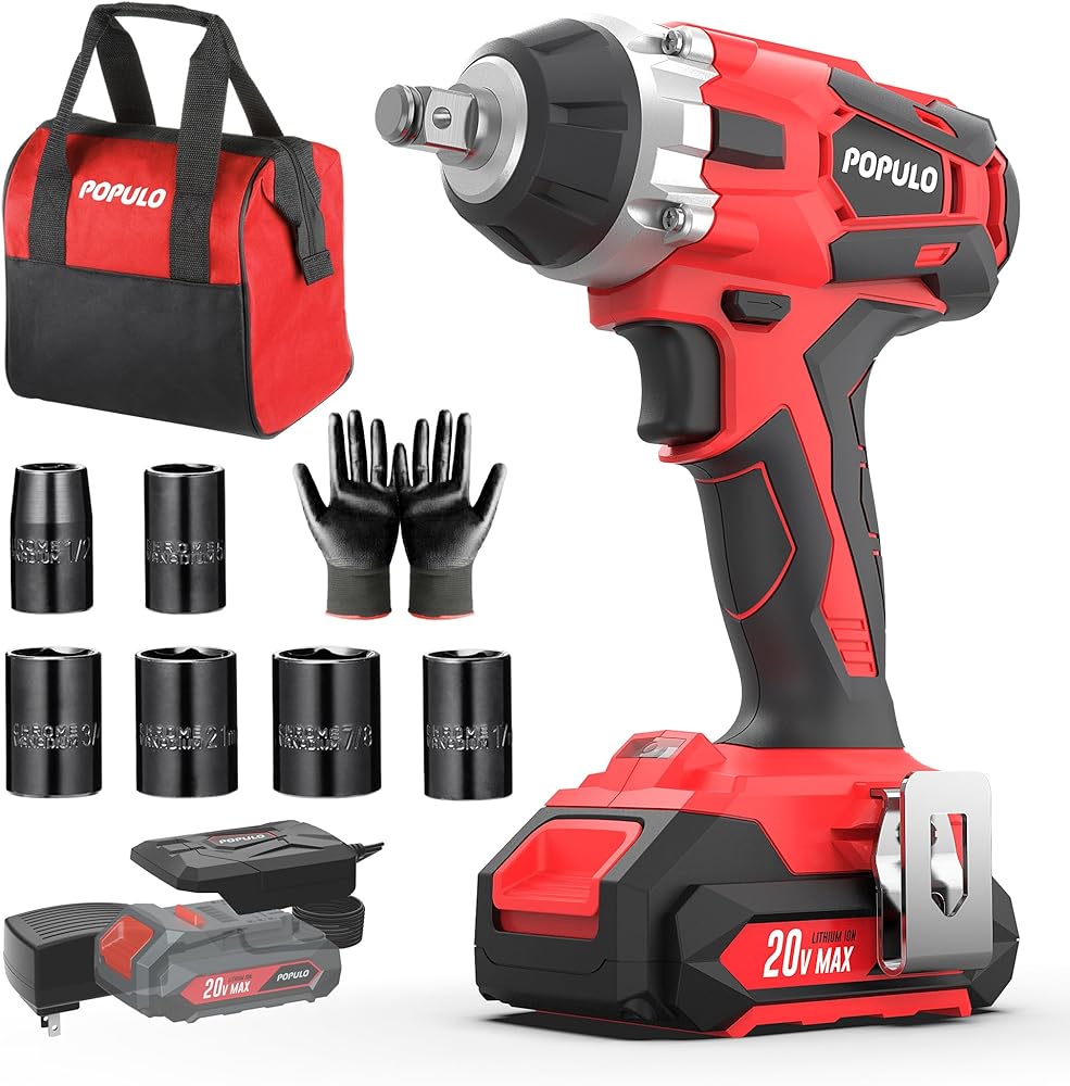 【Package Contents & Warranty】Populo electric impact wrench kit included impact wrench (bare-tool), 1pc 2.0Ah Li ion battery, 1pc Fast charger , 1pc belt clip, 6pcs CRV impact sockets (½”, ⅝”,17mm, 3/4”, 21mm, ⅞”), 1pair gloves, 1pc storage tool bag. A complete impact wrench set for home or car use. 30-days full refund if you are satisfied with this purchase. Please feel free to contact us if you have any questions.