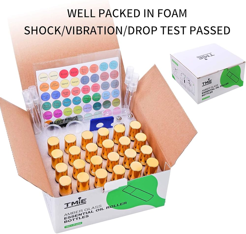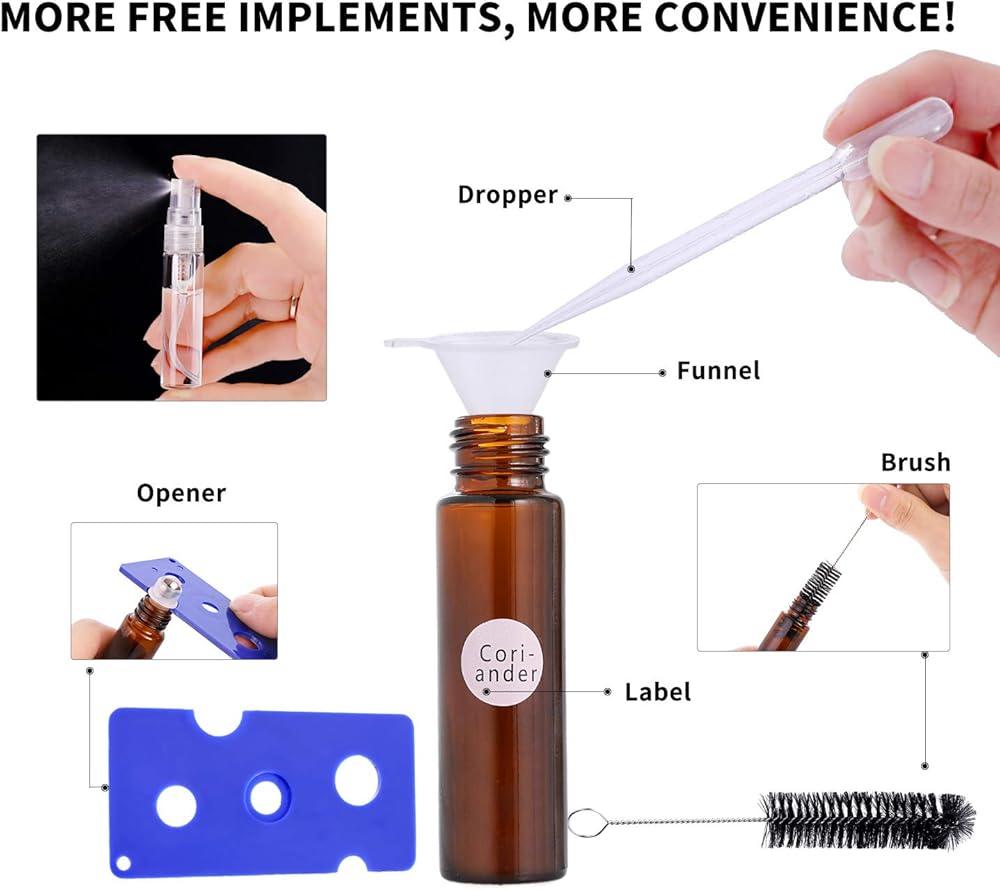 VALUE SET - 24 pack for your different essential oil blends. Abundant free gifts are also involved: 4 extra roller balls, 4 perfume spray bottles, 192 labels, 2 funnels, 2 droppers, 1 opener and 1 brush.