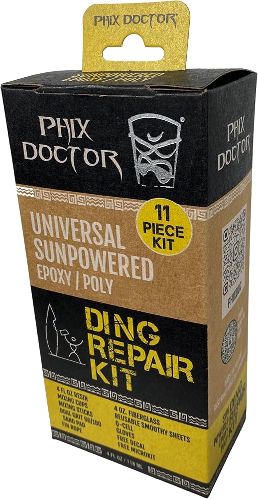 The SunPowered Epoxy Kit by PhixDoctor is a universal surboard repair kit that works for both Epoxy/Poly boards that uses premium, non-yellowing and endless shelf life sunpowered resin that sets up fast and nearly showroom perfect in 1 minute. The SunPowered Epoxy repair kit contains 4 oz fiberglass cloth, sandpapers, smoothy sheets, pair of gloves, mixing cups & sticks, sticker, 1 free micro kit and easy instructions in 7 languages.