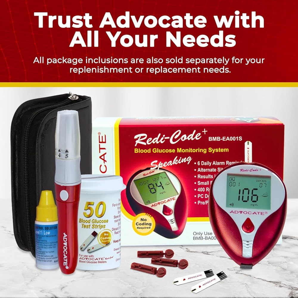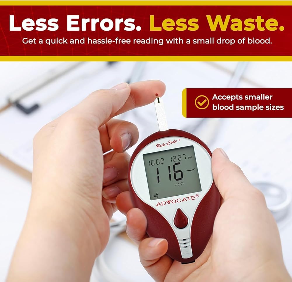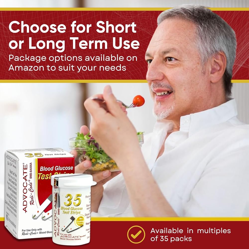 Experience a new level of ease with the Advocate blood sugar glucose test strips. This pack is more than just a bundle of test strips; it's a vital tool for those monitoring their blood sugar levels, offering a perfect blend of accuracy and user-friendly design. Every test strip is a testament to our commitment to precision. Each one is carefully designed and rigorously tested under strict quality control standards. With each use, you're harnessing the power of our 'Double-Checked Accuracy' promise. We understand that your needs are unique. That's why we provide flexible quantity options.Whether you need a short-term supply or a long-term reserve for diligent blood sugar checking, we're here to support you. Simplicity is at the heart of our Advocate Redi-Code+ Blood Sugar Test Strips. Each strip requires only a small blood sample, ensuring a less intrusive testing process. They're compatible with Advocate's range of accurate glucose meters, for an effortless experience every time. Advocate has been a trusted name for 17 years, providing top-grade home healthcare products. Our unwavering commitment to innovation and quality ensures that you can always count on us. Our support extends beyond test strips. We offer a comprehensive suite of blood sugar monitoring system products, including blood sugar test meters, lancets, lancing devices, thermometers, and blood pressure monitors. With Advocate by your side, you're always equipped. Choose the Advocate Redi-Code+ Glucose Test Strips Value Pack. It's more than just a tool for monitoring your blood sugar levels; it's a lifeline in your journey toward better blood sugar monitoring. Trust in Advocate and begin to experience the remarkable difference today. Your journey starts now.