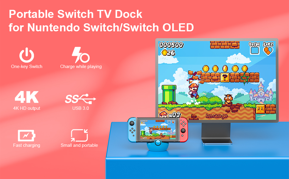 【Multiple port design】 As a replacement for the official Nintendo Switch dock, its working ability is the same as the official standard. All output ports of the TV dock are designed on the back to make the cables look more neatly arranged. There is an USB 3.0 port on the back, which can be used to connect a USB controller, controller adapter, and other accessories allowing you to play in table-top mode with multiple people.