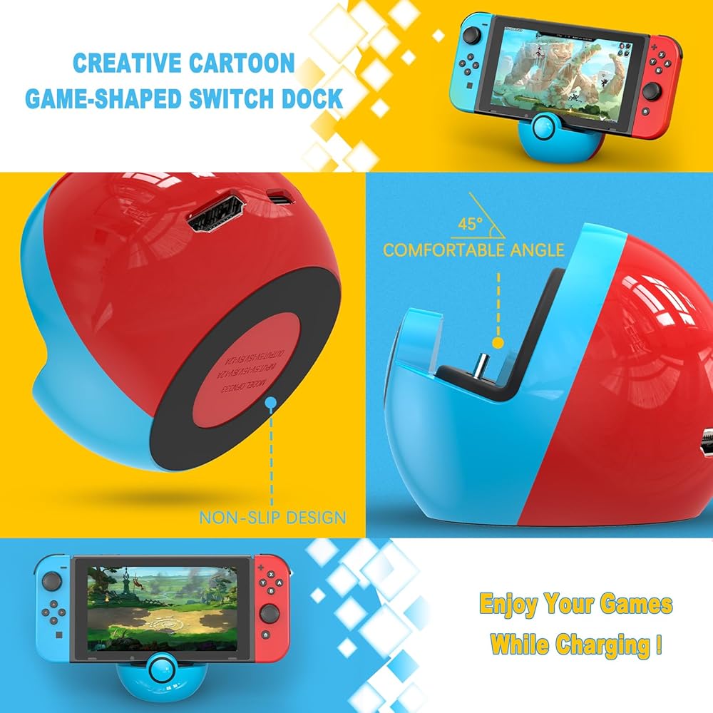 【Unique exterior】 We use the characters in the Switch game to design a switch dock. Not only a portable switch dock but also a game-style decoration stand. 45° elevation angle lets the switch or switch lite, or switches OLED stand to charge instead of sliding into the switch dock station avoiding scratch switch screen.
