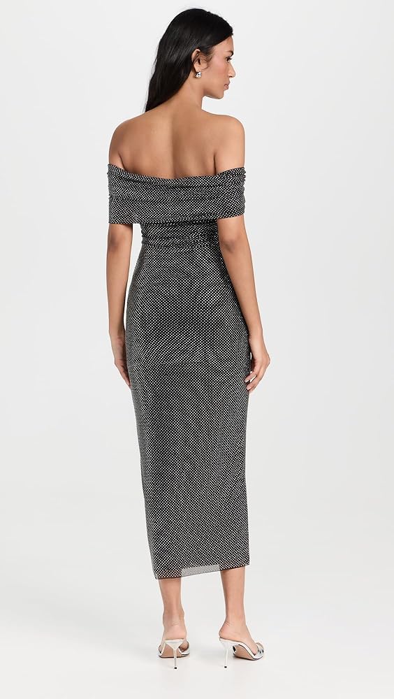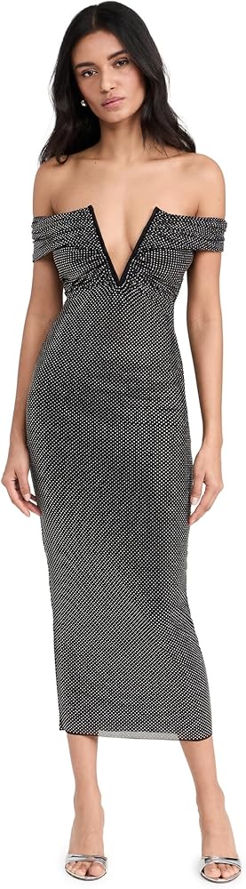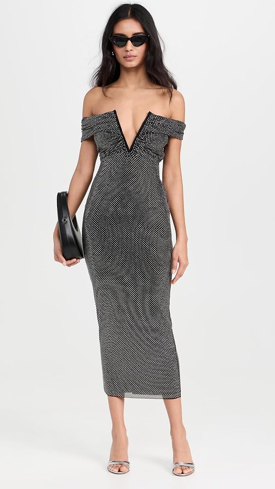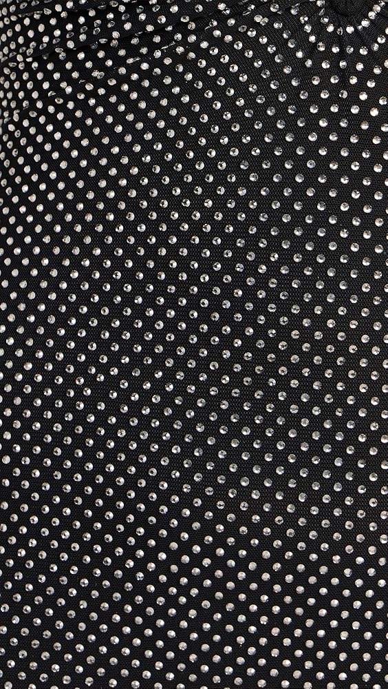 - Allover rhinestone embellishments, Ruched bodice and sleeves, Structured notch at bust