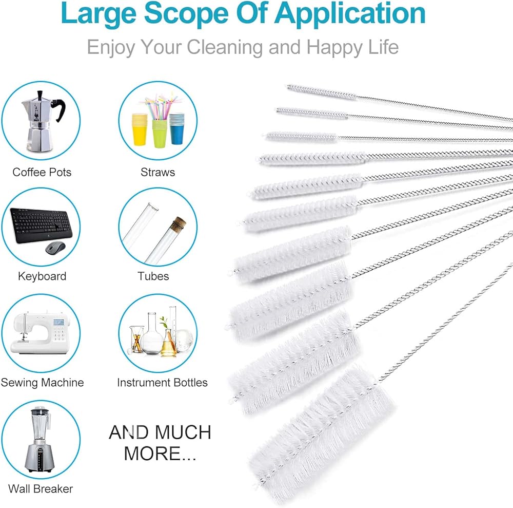 If You're Looking for Bottle Cleaning Brush, This Cleaning Brush Set Which Includes Various Diameters of Brushes is Perfect for Cleaning the Inside of Tube & Bottle with Narrow Necks, Such as Drinking Straws, Pipe, Small Baby Bottles, Dropper Bottles, Computer Keyboard, Coffee Pots, Espresso Machines, Airbrushes, Feeding Tube, Glass Droppers, Small Nozzles, Kitchen Kettle Spout, Teapot Nozzle, Carburetor Passages, Guns, Paint Spray Guns, Sewing Machines, Vaporizers, and more. This Nylon Tube Brush Cleaner Set is Multifunctional and Good Helpers in Your Life!