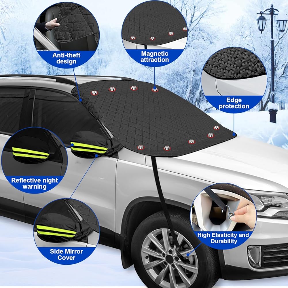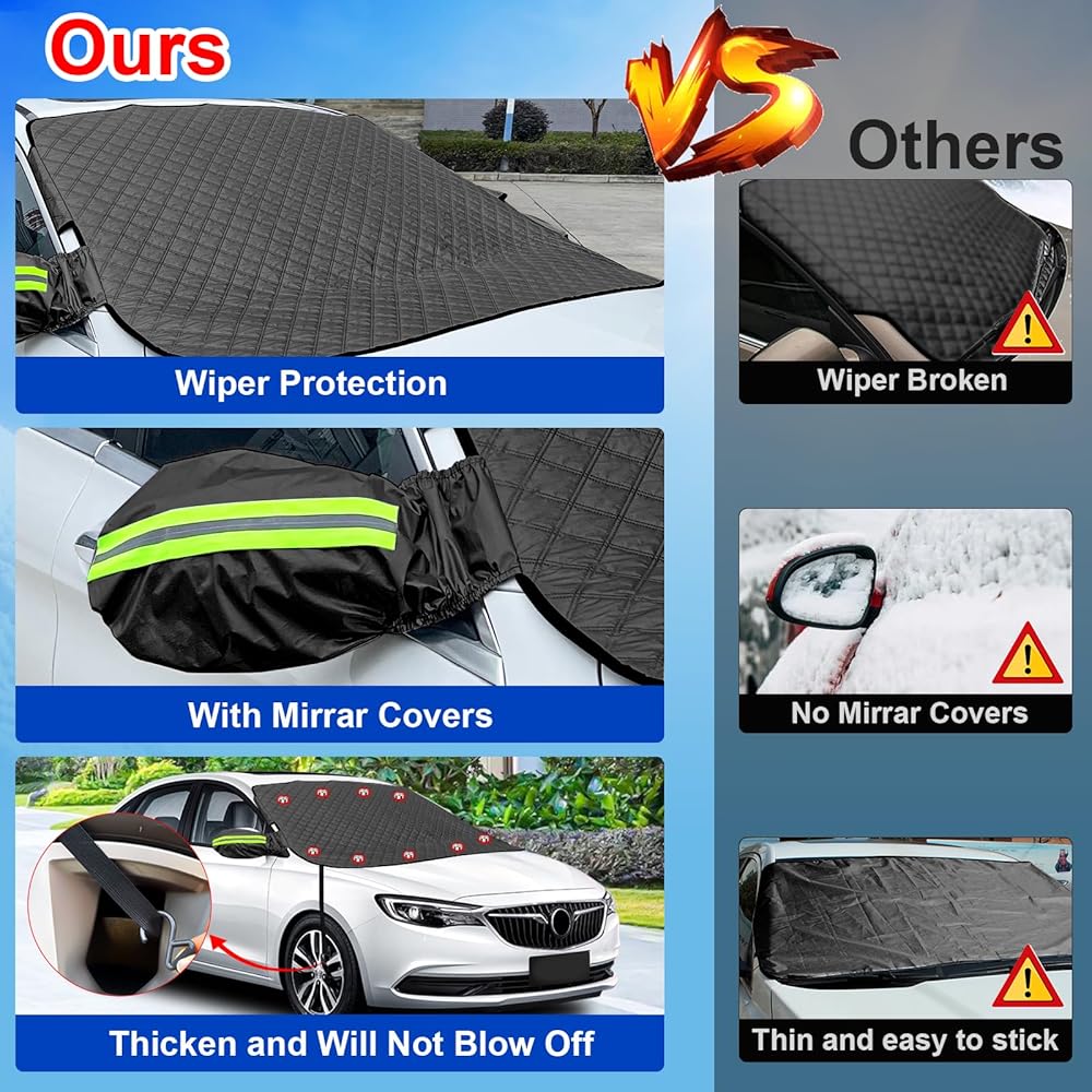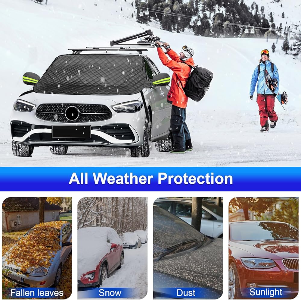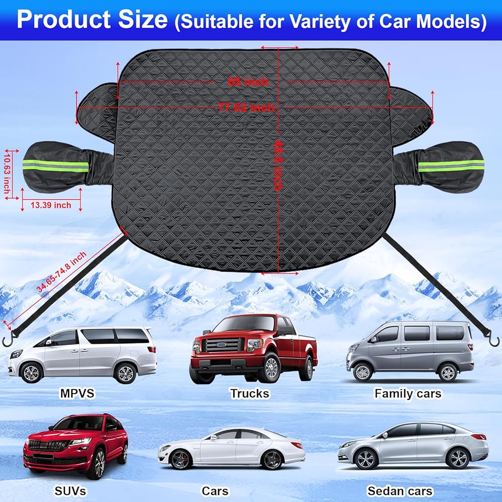 【2023 Upgraded Windshield Snow Cover】: Full protection car windshield cover and side mirror cover protects your vehicle windscreen,wipers and side mirrors from snow,frost, ice and Sun UV-Rays.Quick and easy to install, save time and efforts.Windscreen cover is made of 5 layers of quality materials,Custom made windproof webbing straps help the snow cover stays firmly,the cover will not be blown away.Simply remove the cover and shake-off the snow and your good to go.Suitable for different seasons.