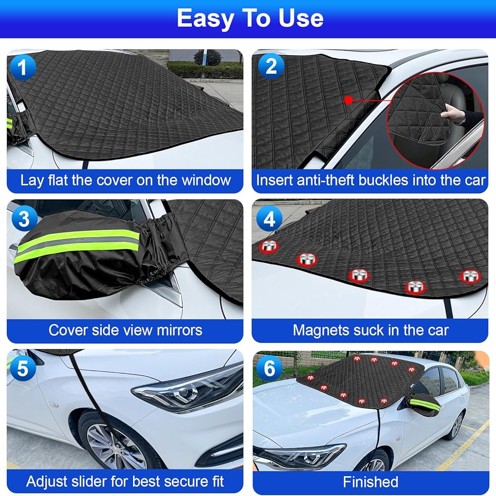【Will Not Blow Off and Easy To Install】: Our car windshield snow cover come with 9 mini Magnets Edge Design,2 fixing straps with hook easily attach to your wheels for secure fit, which can snugly fit your car and the car snow cover is not easy to be blown away. Double stitched door flaps ensure a secure fit that won't tear or come loose. Close the inner vehicle doors to ensure a secure fit to your windshield to effectively block the elements, protect from wind and thieves.