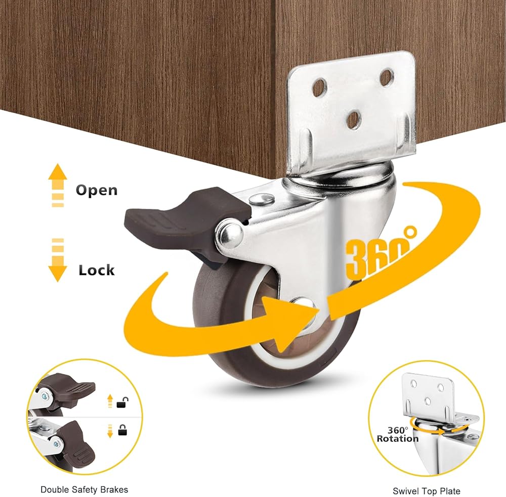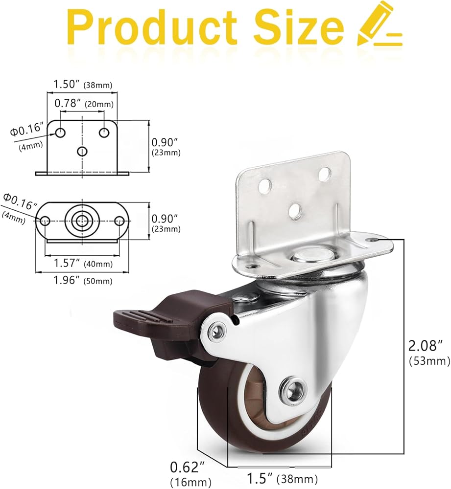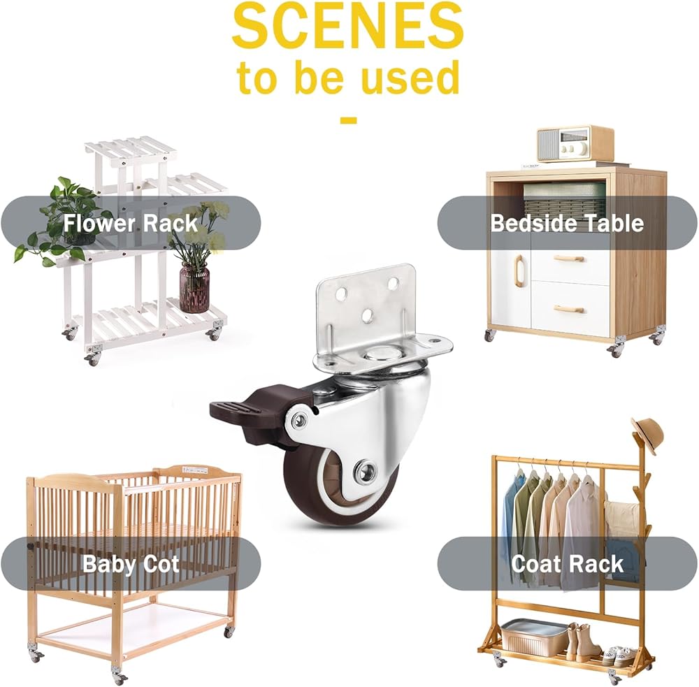🌴Space-Saving Design: With a dimension of approximately 1.26"×1"/ 32×25mm (L×W) and a mounting height of about 1.54"/39mm, these L-shaped plate casters are designed to save mounting space, making them suitable for replacing baby beds, carts trolleys, kitchen cabinets, storage shelves, coffee tables, and workbenches.