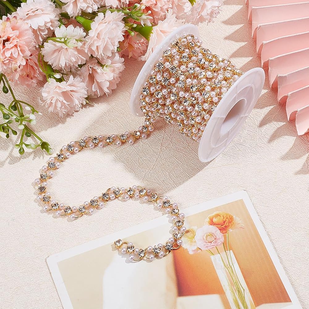 GOMAKERER 6.56 Feet/2M Pearl Beaded Rhinestone Trim, Golden Cubic Zirconia Pearl Beaded Banding Trim for Sewing Crafts Wedding Bouquet Party Clothing DIY Decoration