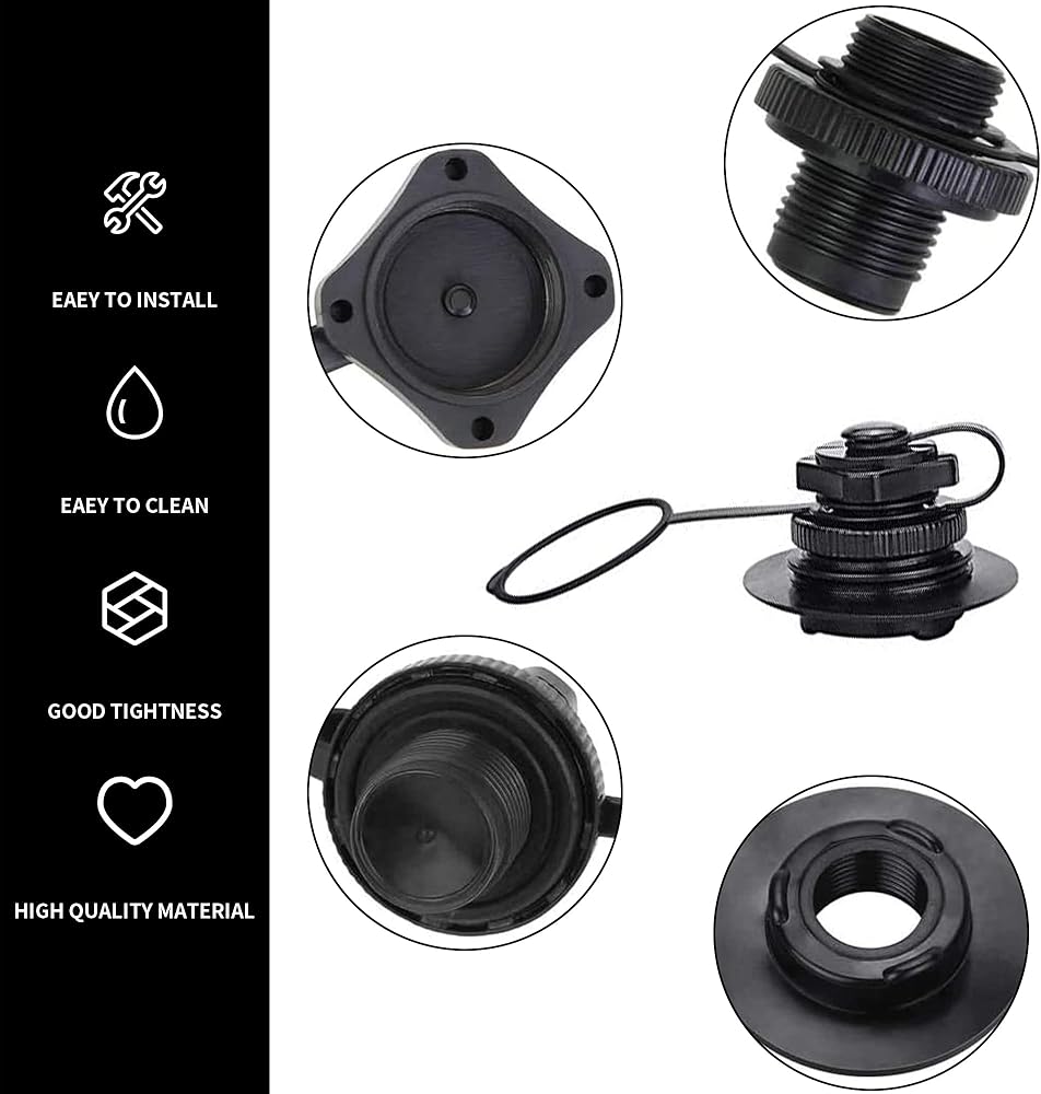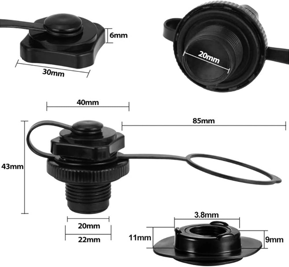 Our products can fit into the bottom 21 mm / 0.83 inch hole. The diameter of the upper part of the thread is about 22 mm / 0.8 inch, and the length of the threaded part is about 12mm / 0.45. inch. There is a rubber pad at the bottom of the air plug to prevent leakage more effectively and protect it more safely. One way inflation valve, fast inflation. Boston valve replacement kits are suitable for most canoes, inflatable boats, rafts, rubber boats, etc. Special note: Thank you very much for purchasing our products. We sincerely ask you to measure the valve size before purchasing the inflatable boat, so as to prevent you from buying the wrong size! thank you very much! Boston valve is made of high-quality high-density ABS plastic, strong, corrosion resistant and durable Great for quick inflation due to its design, avoid using this product immediately, considering your safety, please test it before departure. It takes only a few minutes to place, convenient to assemble and Specification: Material:PVC Color:black Size:The thread part measures approx 0.86inch/20-22mm in diameter and 0.45inch/12mm in length. Quantity:2 set