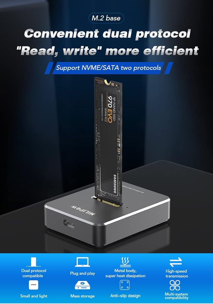 MiliPow M.2 SATA & NVMe Docking Station USB 3.1 Gen2 Dual Protocol M.2 NVMe/SATA to Type C Hard Drive Enclosure for 2230/2242/2260/2280mm M.2 Drives, Plug and Play
