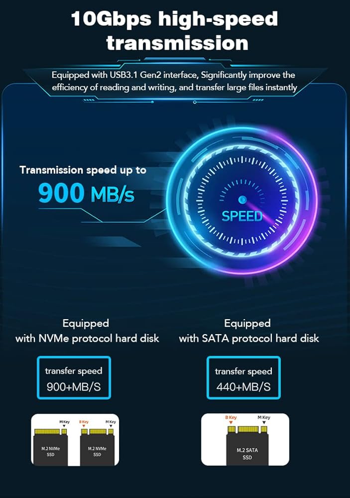 【Supports both SATA and NVMe】This nvme enclosure supports two different M.2 hard drives, M.2 NVMe and SATA in 2230/2242/2260/2280mm sizes. NVMe hard drive case only supports M key and B+M key. Adopting RTL9210B master control escort, 10Gbps high-level master control method, no need to deploy two additional hard drives, saving time, effort and money.