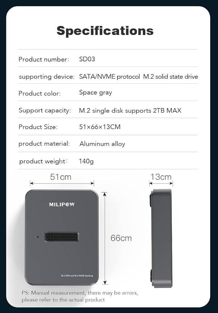 【Package Contents】1 x MiliPow hard drive enclosure, 1 x USB A to USB C cable,1 x USB C to USB C cable. We offer a 30-day money back guarantee, 12-month quality warranty, and 24/7 friendly customer service. If you encounter any initial defects or other problems, please do not hesitate to contact us.