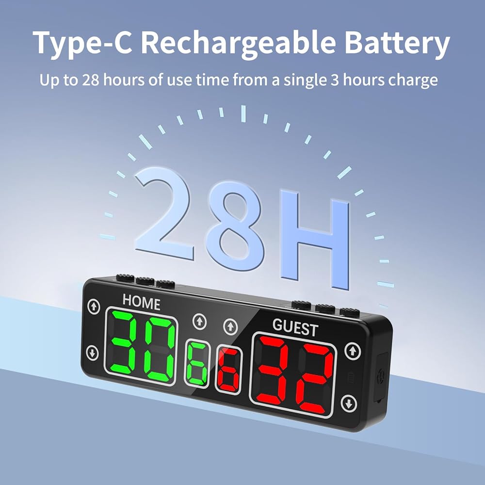 【Long-Standby Battery & Power Failure Memory】: LED digital scoreboard with a built-in rechargeable battery.4 hours fully charged, can operate continuously for up to 24 hours, ensuring that you never run out of power during your events.When the game needs to be stopped, the scoreboard will remember the scores. Don't worry about losing scores when the battery runs out.The convenient Type-C charging port lets you charge easily with a power bank or socket.
