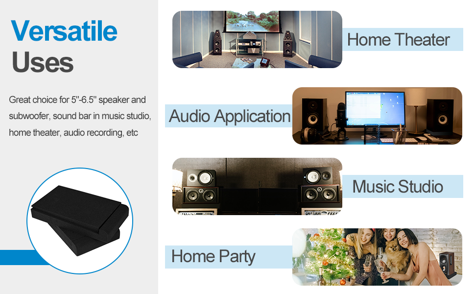 Versatile Use: The sound isolation pads can be used in studio and desk for home studio and theater, audio recording, sound bar volume, bookshelf speaker and sub woofer.