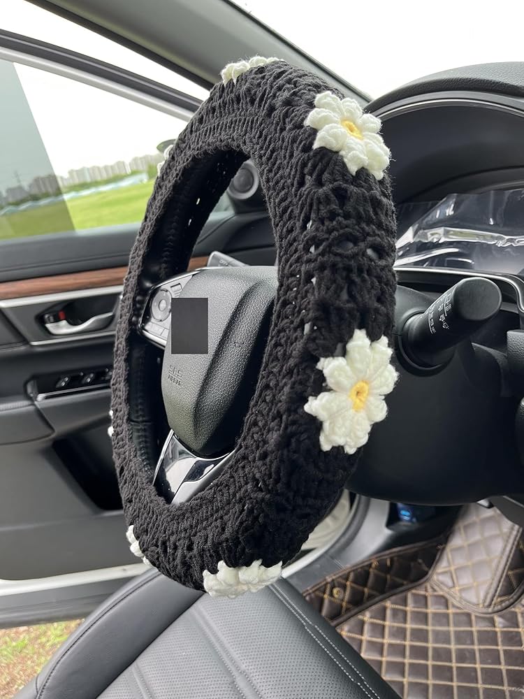 Handmade crochet black color 3D daisy steering wheel cover,seat belt cover