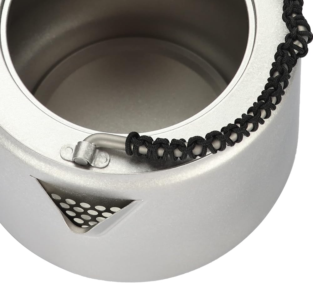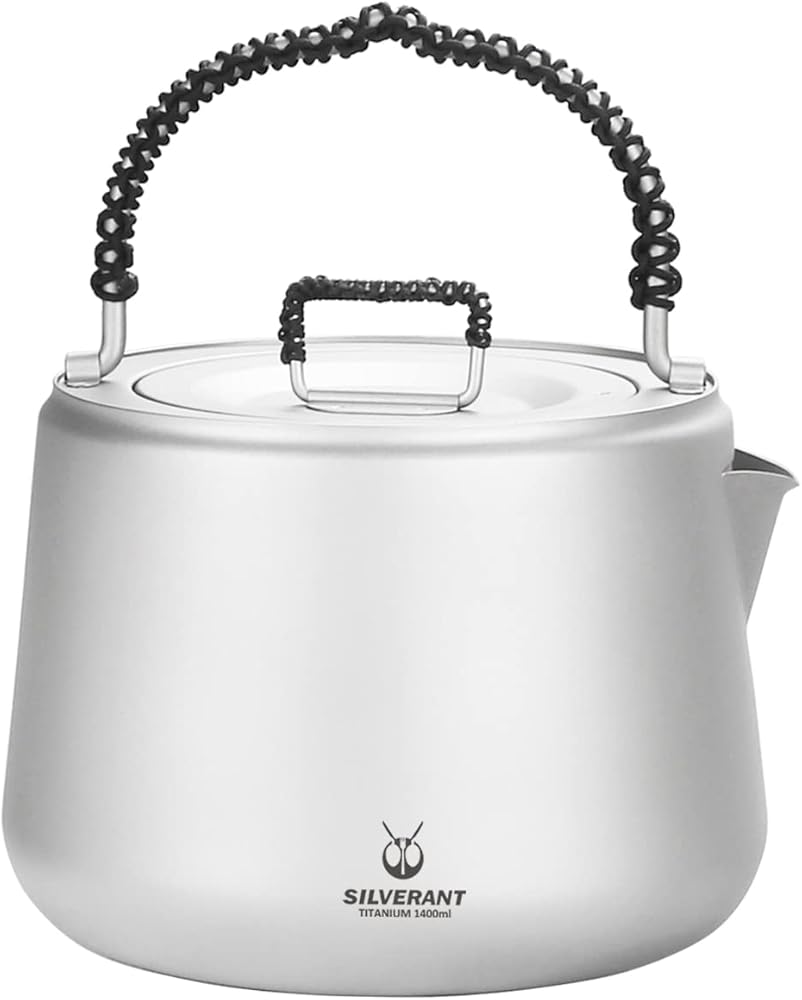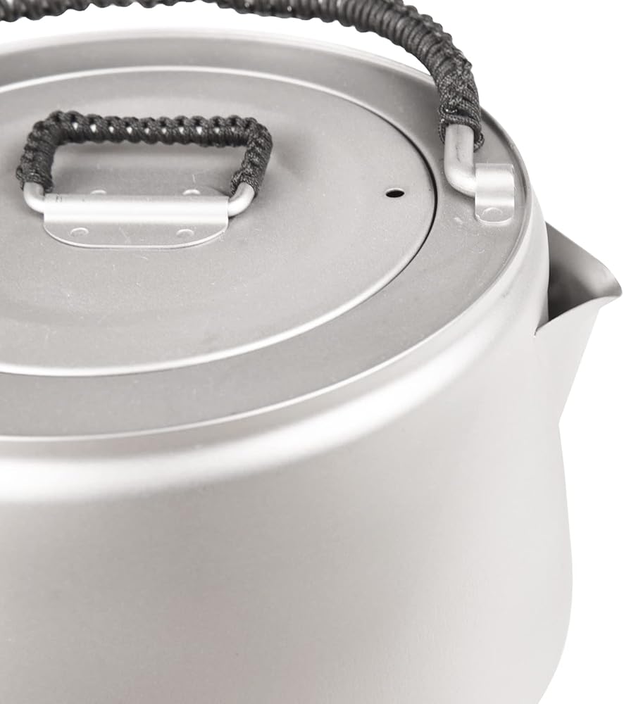Titanium - For ultralight outdoor gear there is no better material than Titanium! It's a lightweight, strong, and durable material that's built to for all environments. A large titanium kettle whether camping or glamping is a great addition to your gear bag. With titanium's increased heat conductivity boil water quicker on your stove for cooking as well as the morning tea or coffee.