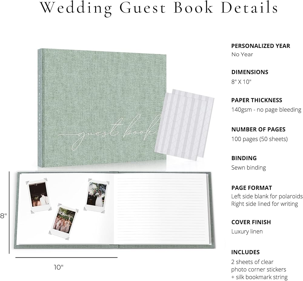 QUALITY TO LAST A LIFETIME - Reminisce on your special day for years to come with premium 8x10” hardcover grey linen guest sign-in book, 100 blank and lined pages (50 sheets), silk bookmark, strong sewn binding. Thick 140gsm paper so no page bleeding. Completed kit with 2 sheets of picture corner stickers to secure photos.