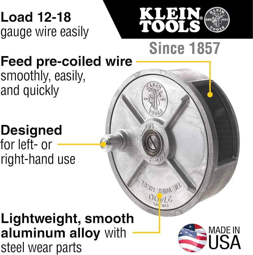 Klein Tools' Quick-Lock Tie Wire Reel is engineered for unmatched speed and efficiency. With a cutting-edge push-button and sliding latch system, this reel enables lightning-fast spool replacement, surpassing traditional models. The two-step lock ensures a secure lid connection, while the top handle allows effortless removal and quick alignment to base. The large, rotating knob offers sure grip when winding reel for right and left-handed users. Constructed from durable aluminum and featuring a corrosion-resistant black coat, this reel is designed to last.