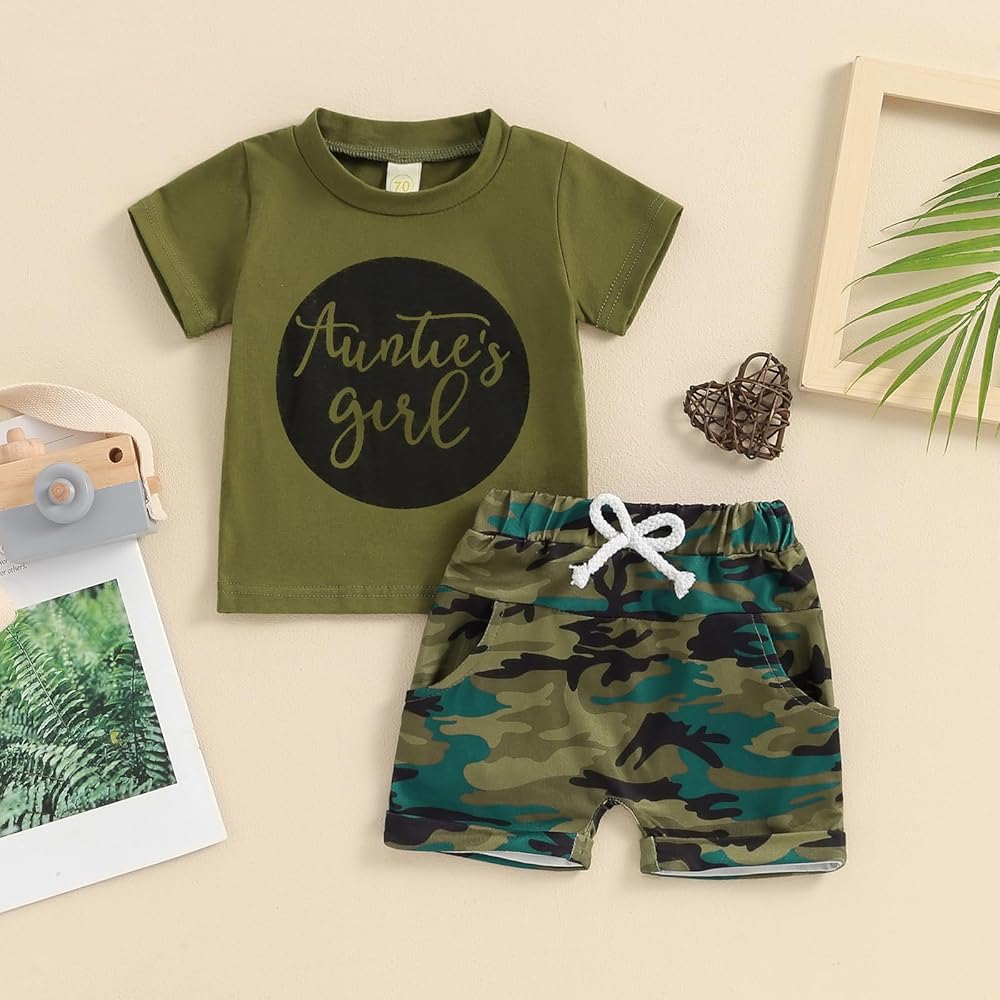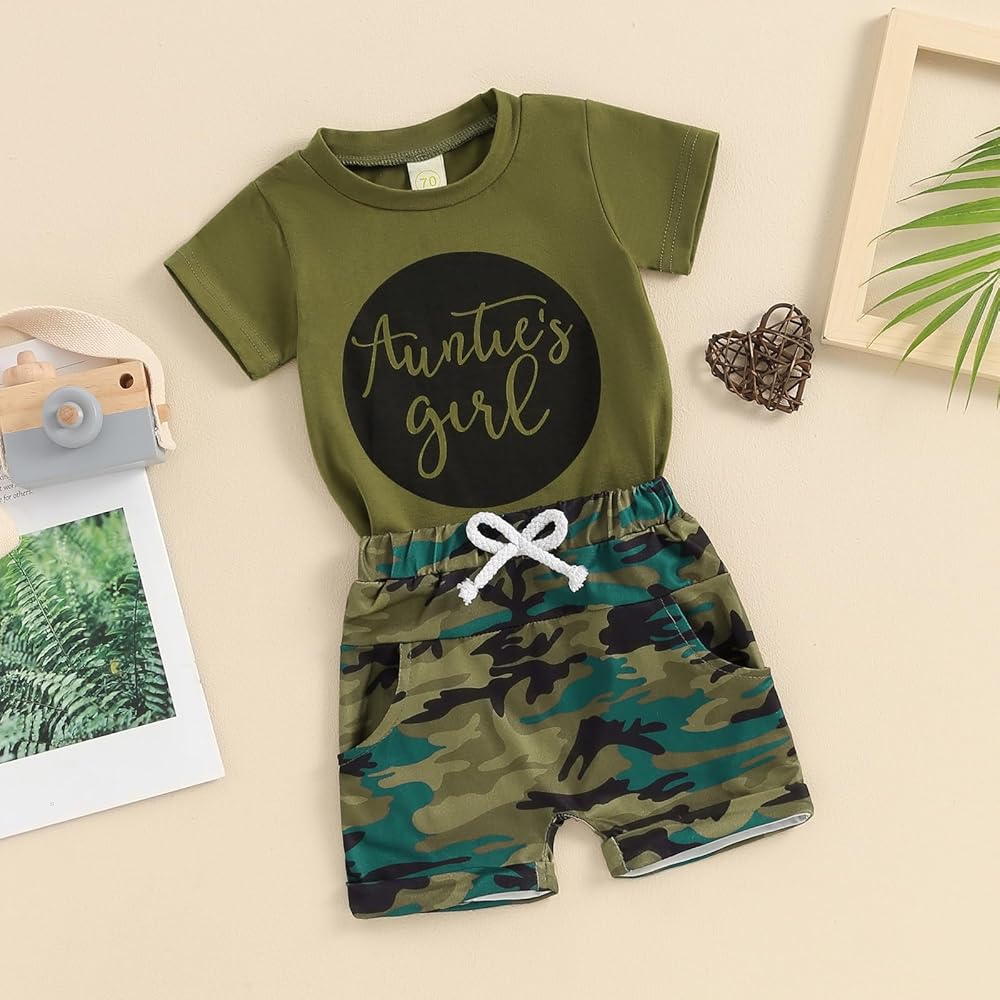 Design: Baby boy girl aunties saying clothes. Little boy short sets, short sleeve, round neck, letter print, casual tops, camouflage shorts, drawstring shorts, very skin-friendly.Toddler boys summer 2pcs outfit sets, short sleeve round neck letter print t-shirt + solid color drawstring shorts