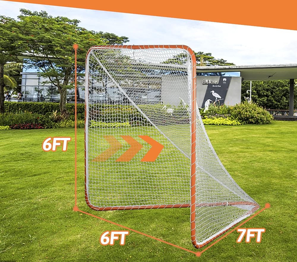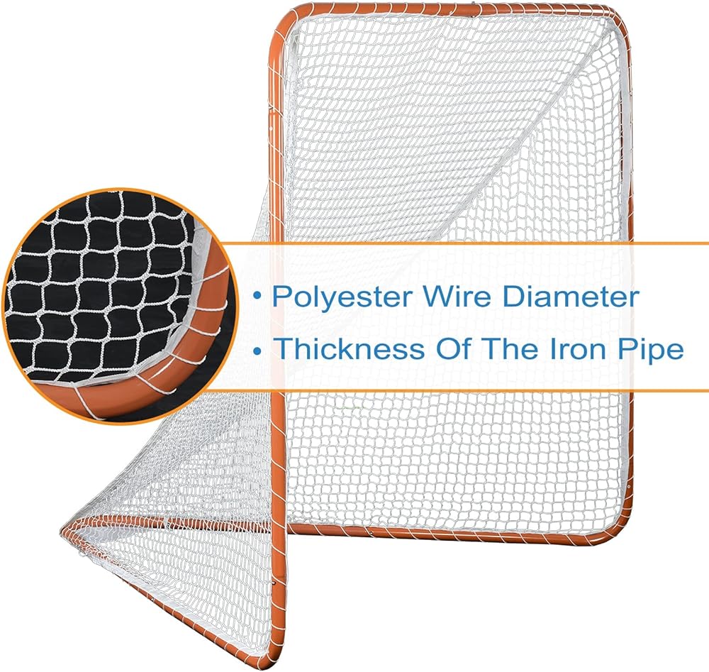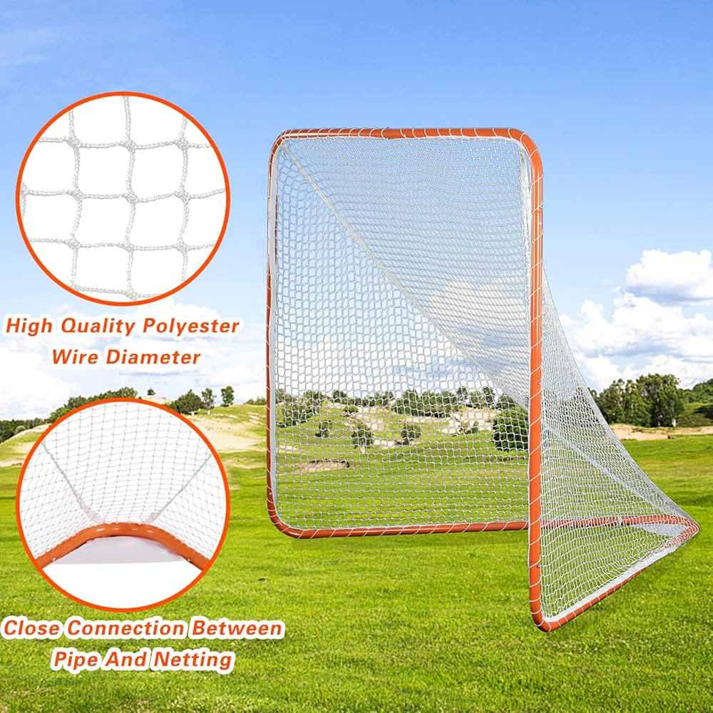 【Lacrosse Goal With High Quality Materials】The high-density polyester netting of this lacrosse goal is closely connected with the reinforcement edge, and will not be loose, torn or fall off. The solid powder coated steel frame ensures amazing strength and can withstand strong swing. This portable Lacrosse goal can be more durable.