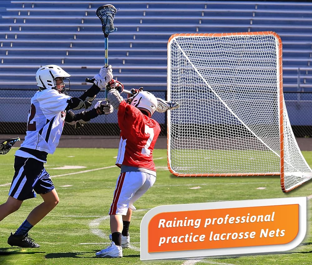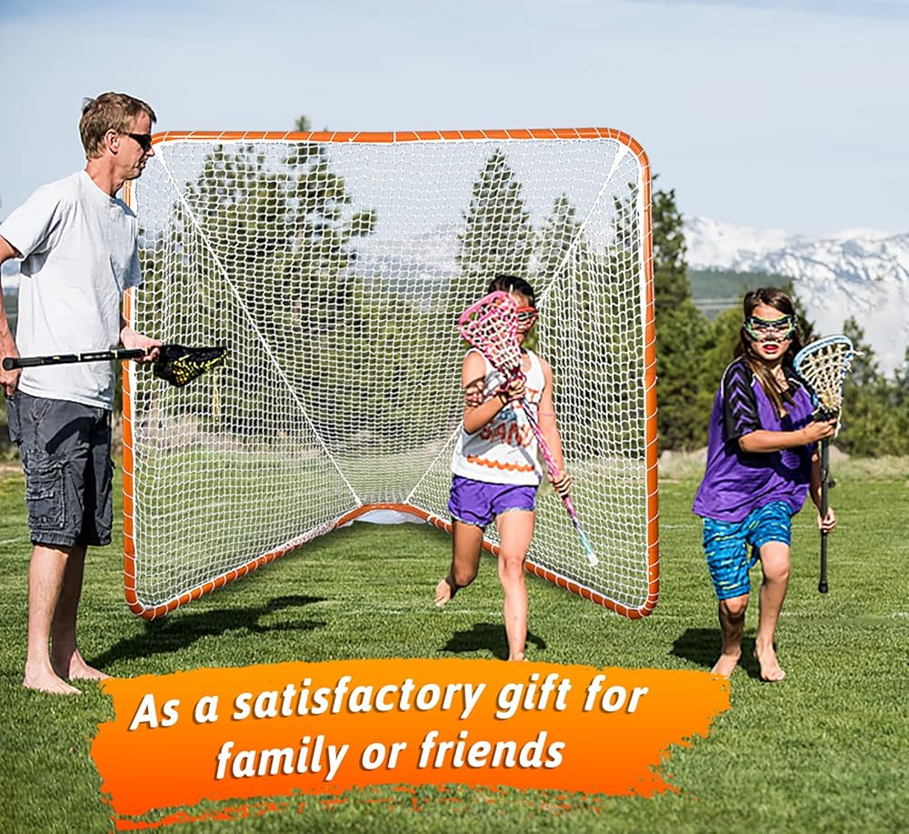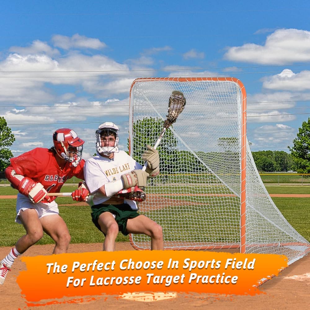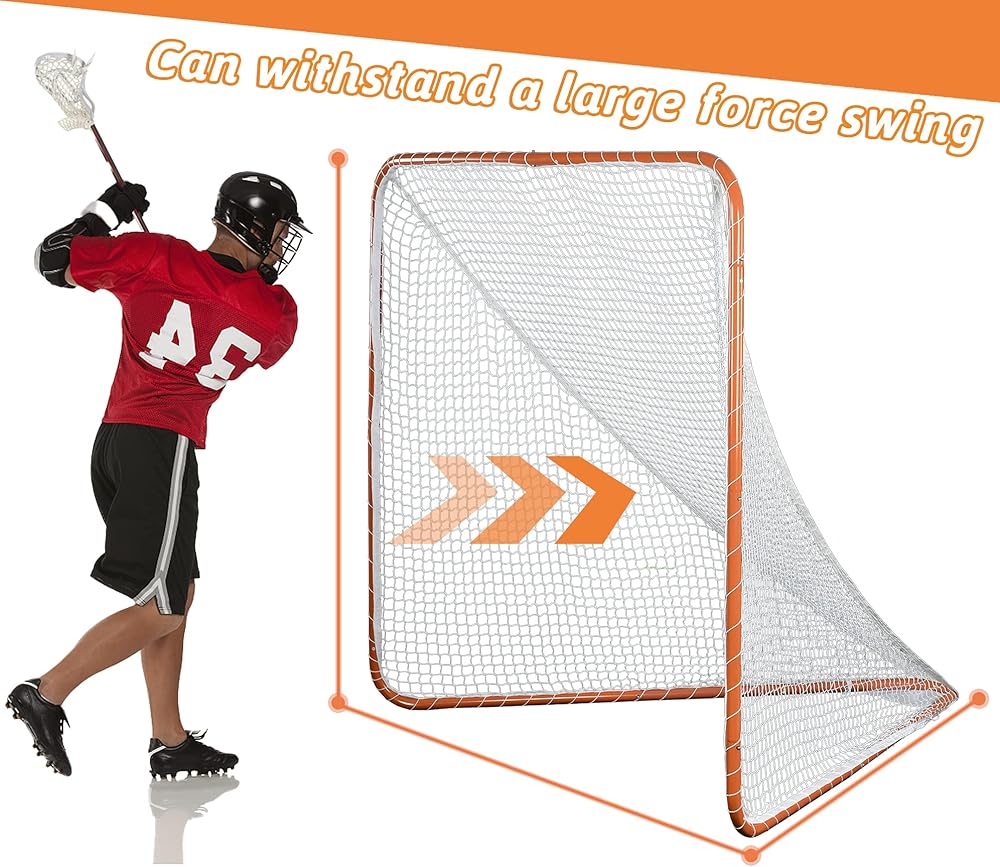 【Lacrosse Goal With High Quality Materials】The high-density polyester netting of this lacrosse goal is closely connected with the reinforcement edge, and will not be loose, torn or fall off. The solid powder coated steel frame ensures amazing strength and can withstand strong swing. This portable Lacrosse goal can be more durable.