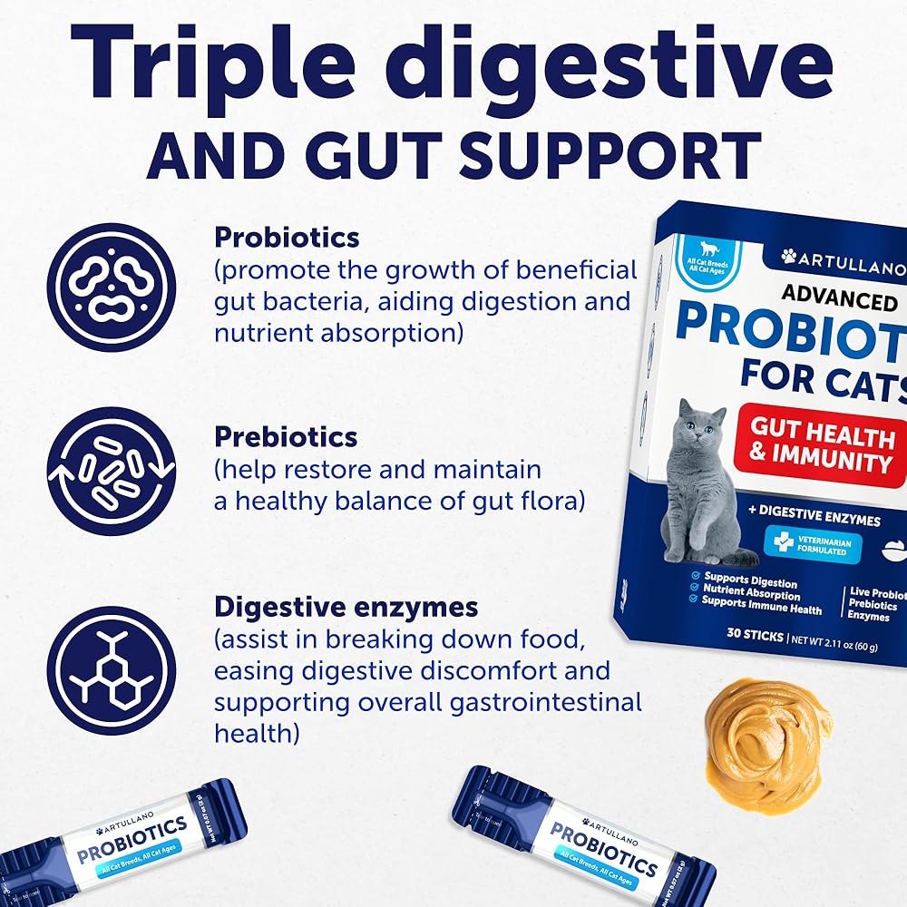 Probiotics for Cats - Supports Digestion, Immune Health & Gut Health - Nutrient Absorption - Digestive Enzymes - 30 Sticks