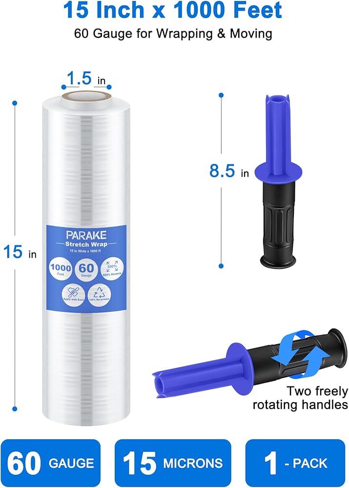 Durable Stretch Wrap: Each plastic wrapping roll is 15 inches in width x 1000 feet in length, thickness 60 gauge (15 microns). You will receive 1 roll of stretch film and 2 reusable rotating handles