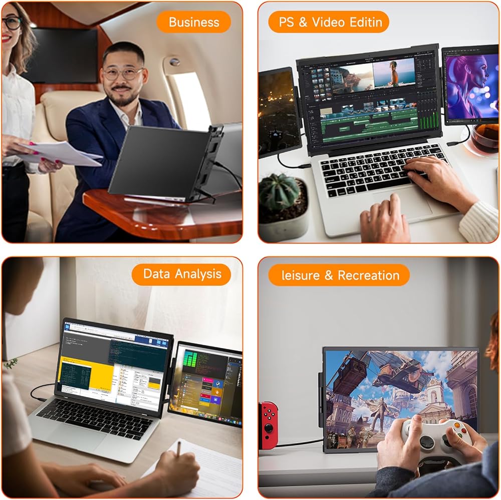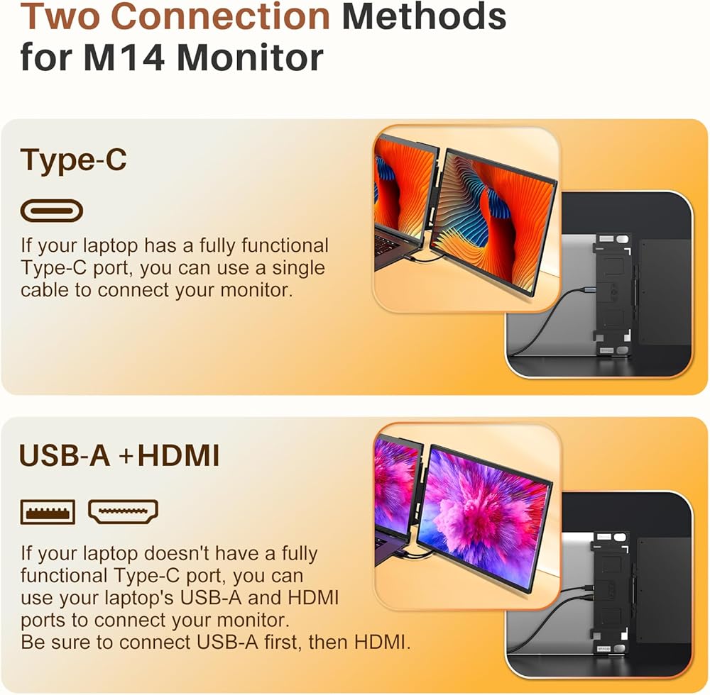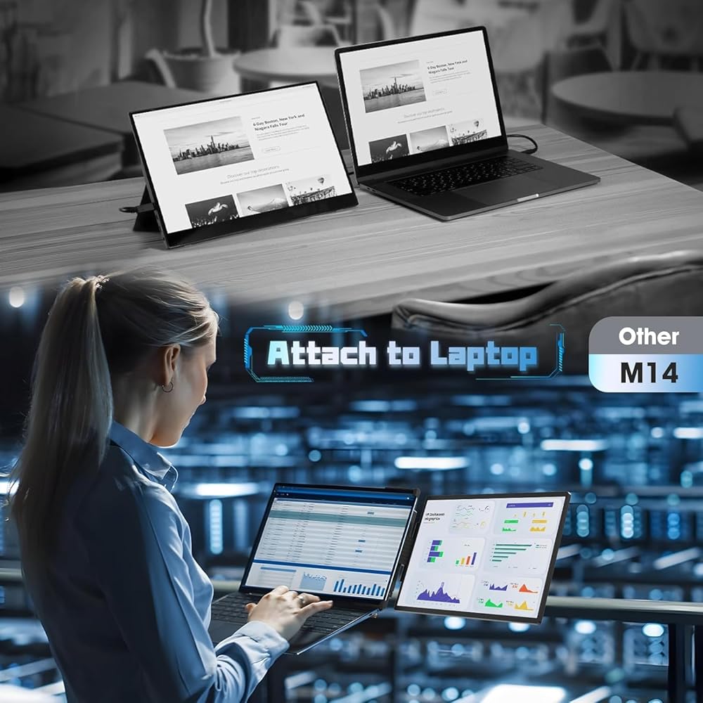 🔔𝐂𝐨𝐦𝐩𝐚𝐭𝐢𝐛𝐥𝐞 & 𝐌𝐮𝐥𝐭𝐢-𝐩𝐮𝐫𝐩𝐨𝐬𝐞.This extended laptop monitor portable is equipped with two full-featured USB-C ports and an HDMI port, suitable for Windows, MacOS, UNIX, Linux system 13.3-16-inch laptops, Switch, Xbox, PS3/4/5. You can use it in multiple ways: 🫶1. Attached to a laptop, 🫶2.Portrait mode. 🫶3.As a regular portable screen. And can be rotated up to 210°.Whether it's work or entertainment, with an M14 monitor, you will have a new experience, as if you have entered.