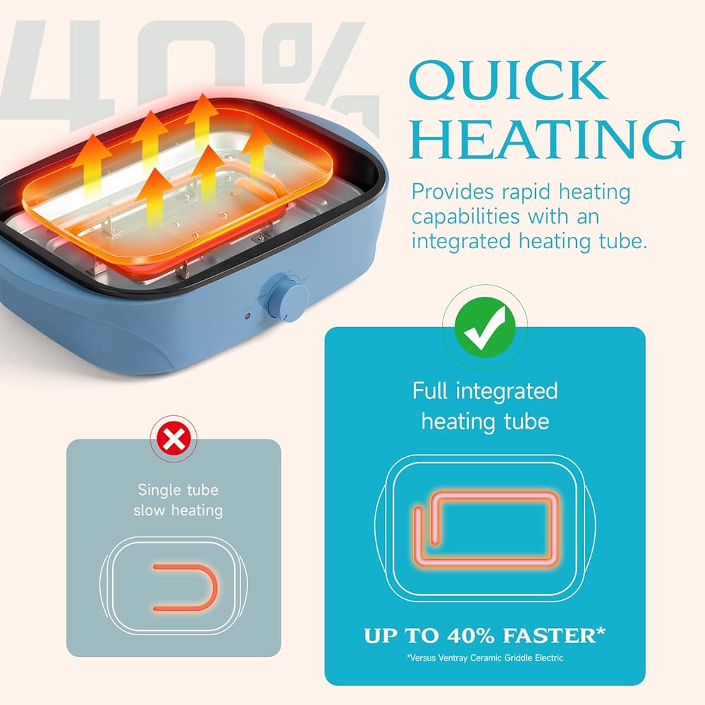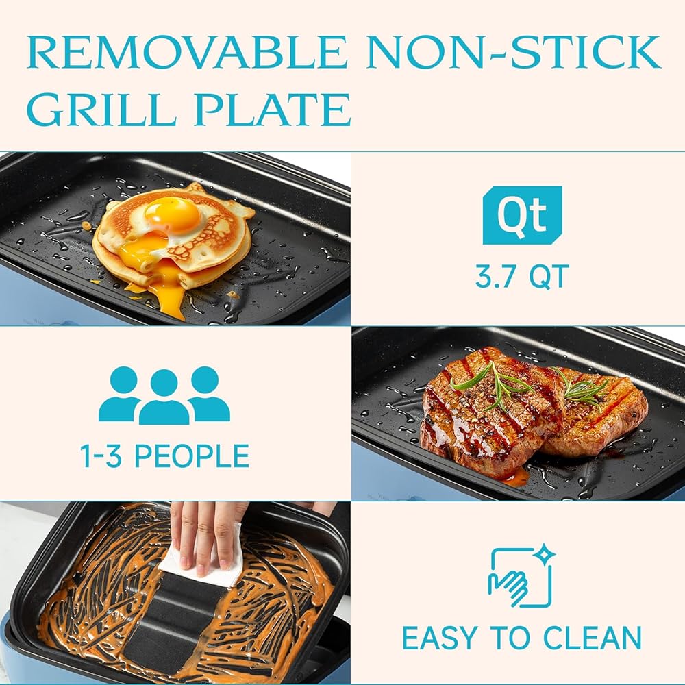 Ventray Electric Skillet Compact Tabletop BBQ Grill with Removable Stir Frying Griddle Pan and Lid, Electric Indoor Grill with Non-Stick Cooking Surface Adjustable Temperature - Blue
