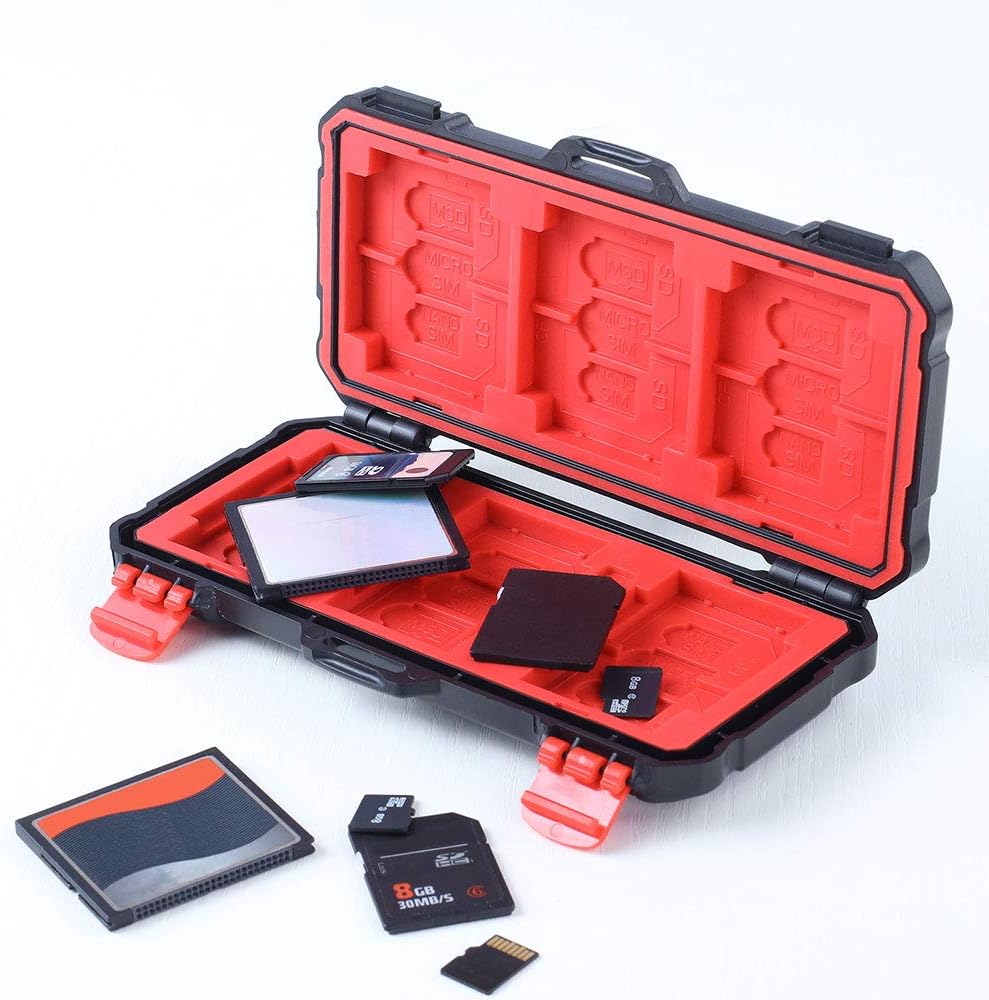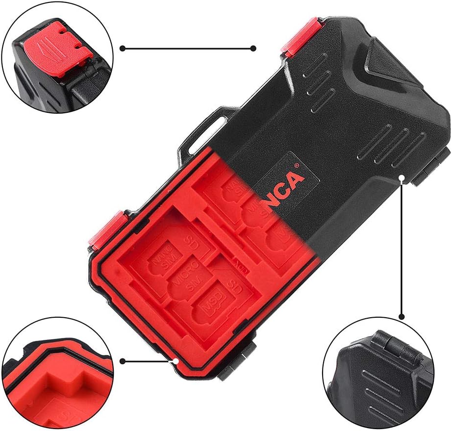 【السلامة】بطانة داخلية مطاطية مصبوبة، جزء خارجي متين من راتينج البولي كربونات مع قفل مقاوم للطقس لمنع الماء والغبار والحطام باستخدام مادة ABS والمطاط البلاستيك الحراري، تحمي بطاقة ذاكرة الكاميرا الخاصة بك من التلف.