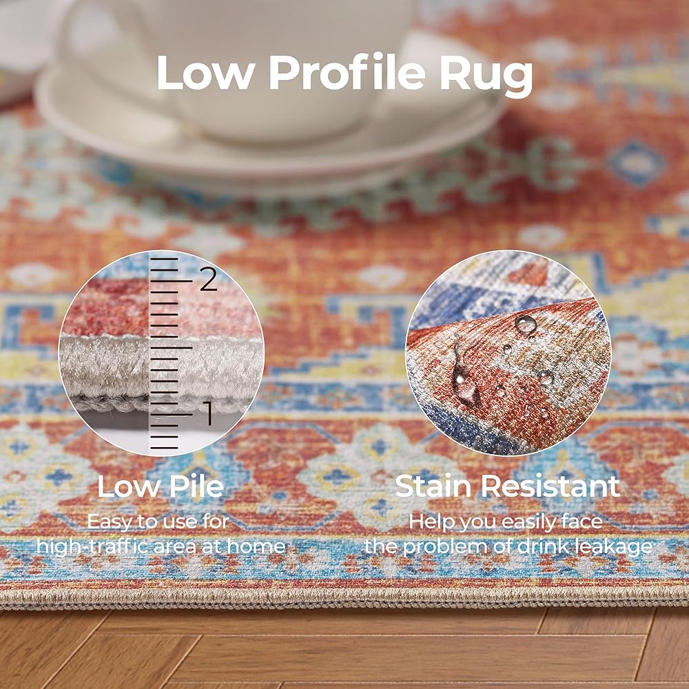 Wear-Resistant Material: Kokia area rug is made of materials with a dense and clear chenille texture,long-lasting. It is lightweight, non-shedding. Thin low-pile carpets are more recommended for use on laminate and hardwood floors, offering a good suport of feet.