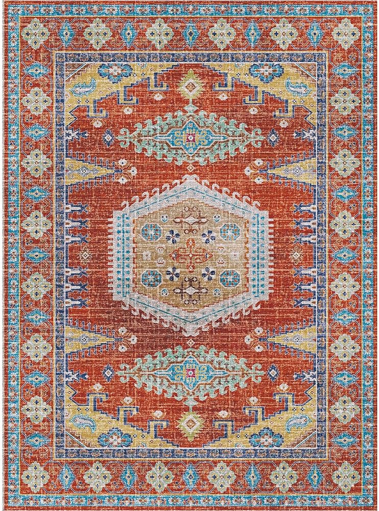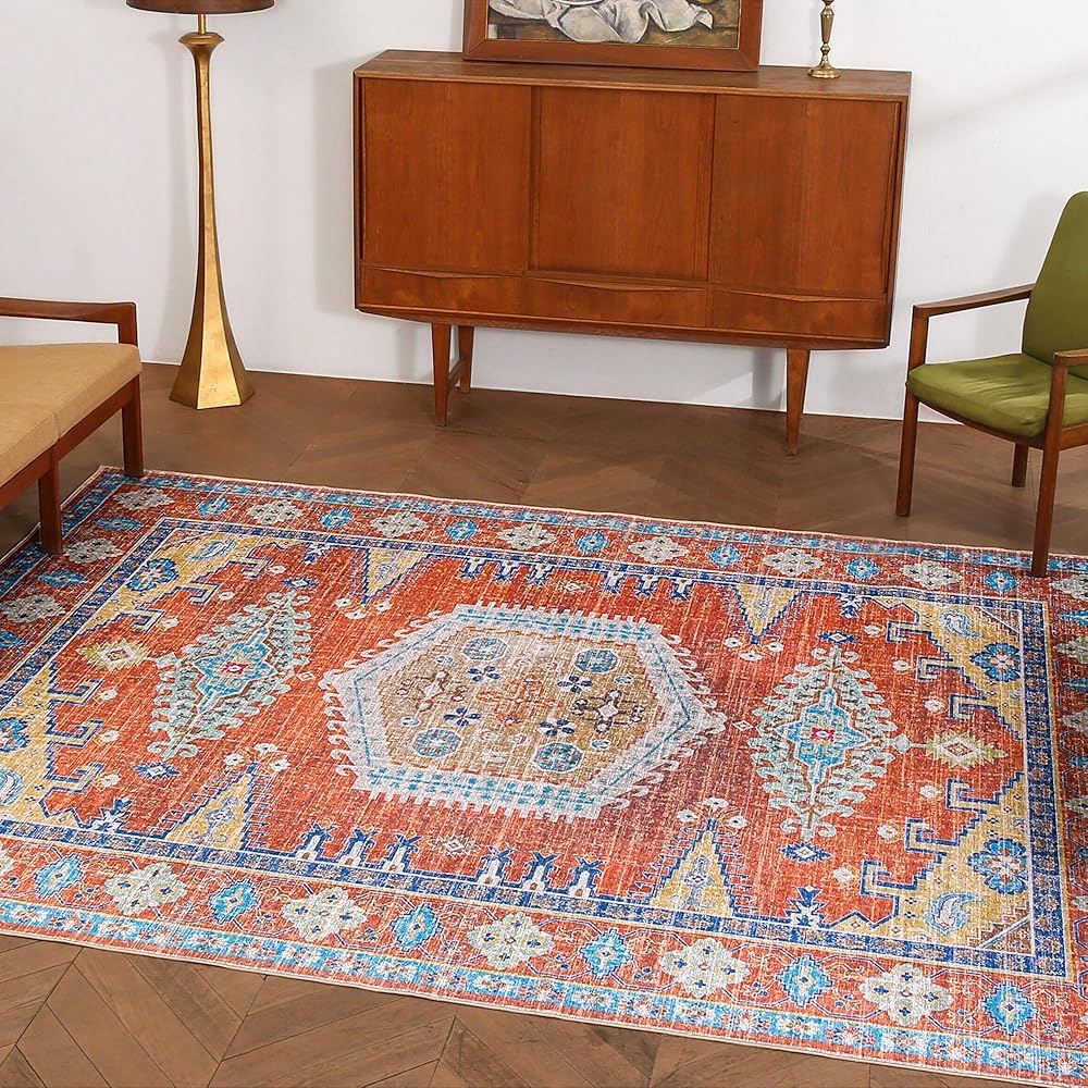 Kokia Area Rugs Living Room Ultra-Thin No Pile Washable Maple Red Large 6x9 Area Rug Bedroom Geometric Tribal Distressed Lightweight Carpet for Dining Room Home Office