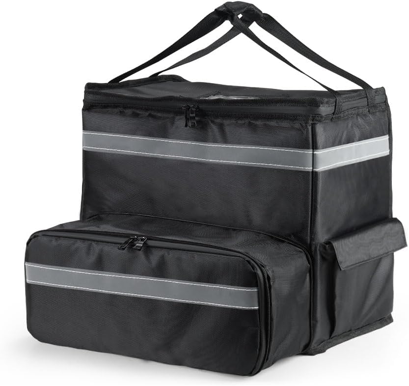 Large Capacity: Food delivery bags are spacious enough to fit most food packages. Pizza bags for delivery for delivery fit up to a 5*12inch pizza box and 20*250ml Coca Cola, Hamburger, sandwiches, beers, snacks etc. Bike delivery backpack folds up flat when not in use for storage. Two Layered designs for more orderly placement of food