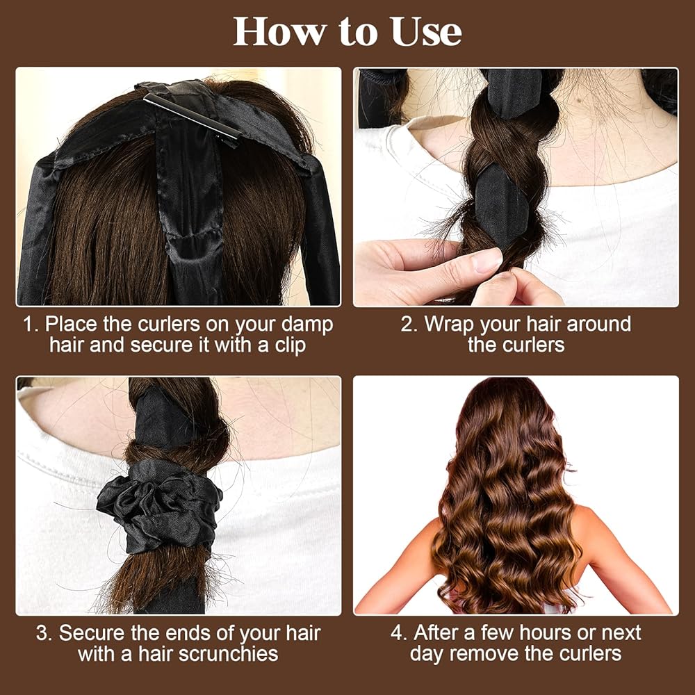 【Easy to Use】--- Start with slightly damp hair, fix the middle position of the heatless curlers with hair clip on the top of your head, then wrap it along the curling rod and fix the end with included scrunchies, the longer the time, the better the effect. You can also use styling products and blow dry your hair with a blow dryer for quick curls.