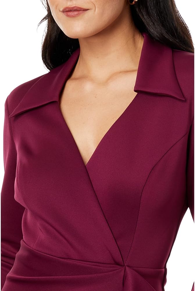 Classy and chic, the XSCAPE Short Scuba Collar Side Ruffle dress is a must-have for all the fashionista out there. The bodycon silhouette complements your curves with the wide-collared V-neckline adding a hint of sophistication to the look. The dress features long sleeves, and a stunning side ruffle detailing that elevates the overall look. Back zipper closure. 95% polyester, 5% spandex. Dry clean. Made in the USA.