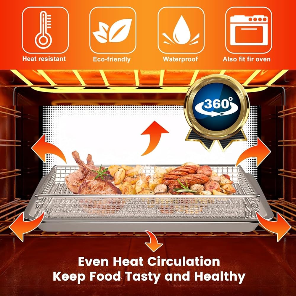 ->360° Heat Circulation. This Mesh basket is above the tray allowing the entire contents of the tray to be surrounded & absorb the heat being emitted. No need to turn or flip your food - making food crispy on the outside but juicy and tender on the inside.