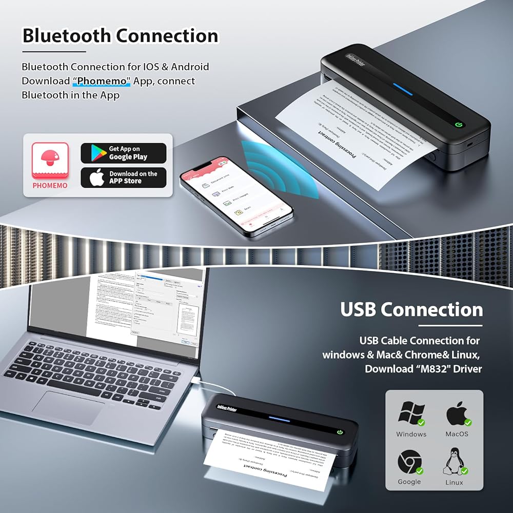 [Simple Operation] -- M832 portable printer is compatible with Android, iOS smartphones, ipads, windows 10/11 and macOS laptops and computers. Wherever you are, you can use bluetooth thermal printer to print Word, documents, PDFs, images, web pages via Bluetooth connection (Download free app “Phomemo” and connect Bluetooth in app). Or, downloading the driver on your computer and print files via USB connection.