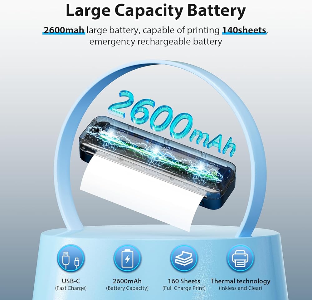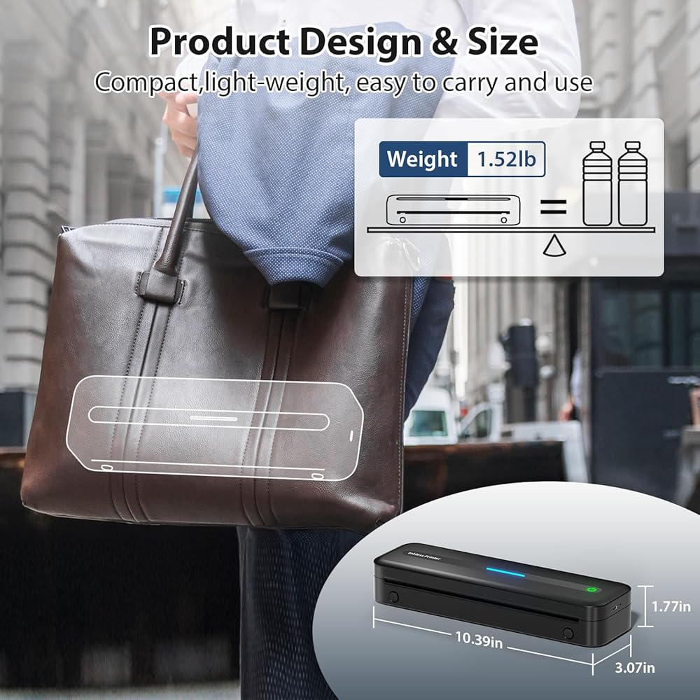 [Compact Design] -- With a built-in 2600mAh rechargeable battery, a lightweight and compact design of 1.5 pounds, the travel printer portable easily fits into backpacks and briefcases. Whether you're on a business trip, outdoor activities, in the car or on a plane, this portable printers wireless for travel will be your right-hand tool, enabling you to print anywhere, anytime!