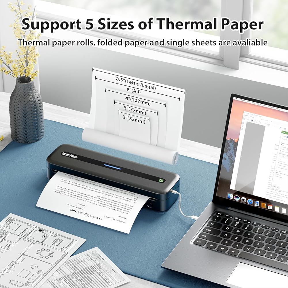 [5 Printing Sizes & 3 Types Paper] -- 5 different sizes of thermal paper can be printed by this wireless inkless printer, 8.5'' x 11'' US Letter to print contracts, documents, invoices; A4 size to print study notes, pictures, blueprints,photos; 2''(53mm), 3''(80mm), 4''(110mm), which can be used to print memos, journals, shopping lists. Enjoy the wide range of printing possibilities with this mobile printer!