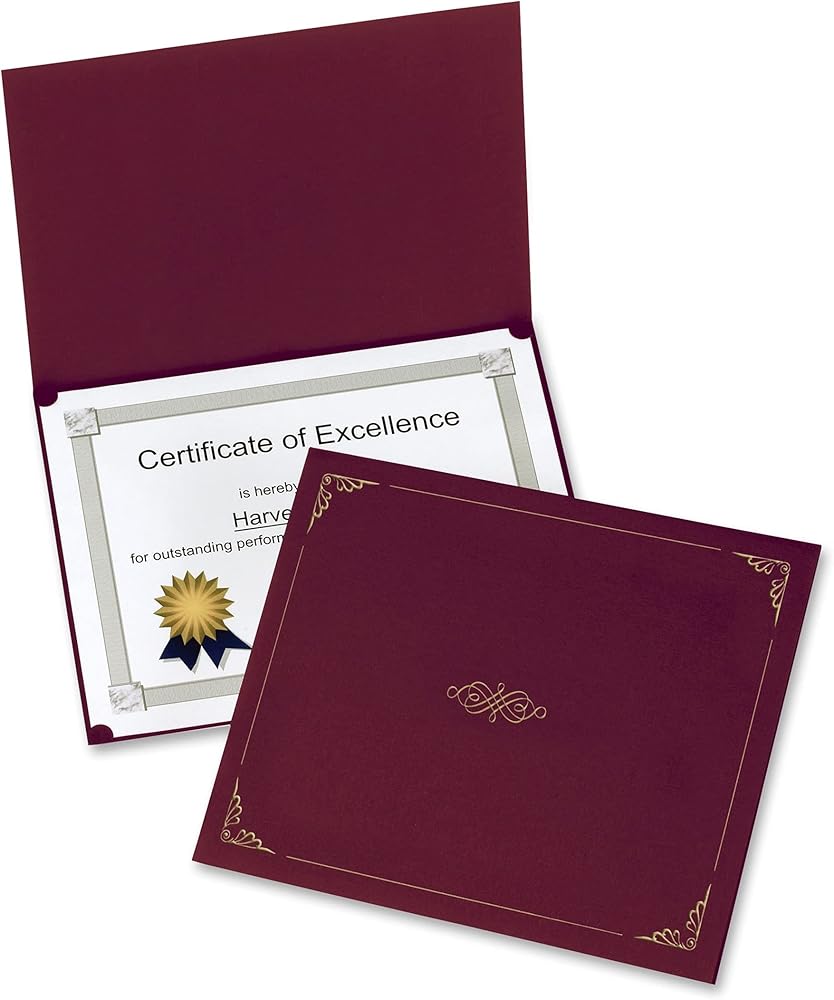 Present awards in style with these Oxford Certificate Holders. The gold-foil embossed, burgundy covers feature a linen-like texture. Sturdy enough to secure and transport letter-sized certificates. Covers made from 30% recycled fiber with 30% post-consumer fiber. 5 per pack.