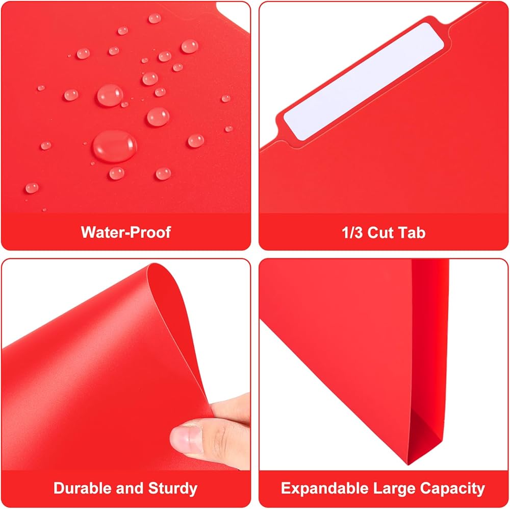 1/3 Tabs and Sticky Labels: featuring a 1/3 top cut tabs, these plastic manila folders provide a spacious area for labelling, easy to view and find the information you need; The pack also includes 48 blank sticky labels to allow you to categorize and label folders, fostering an organizational habit