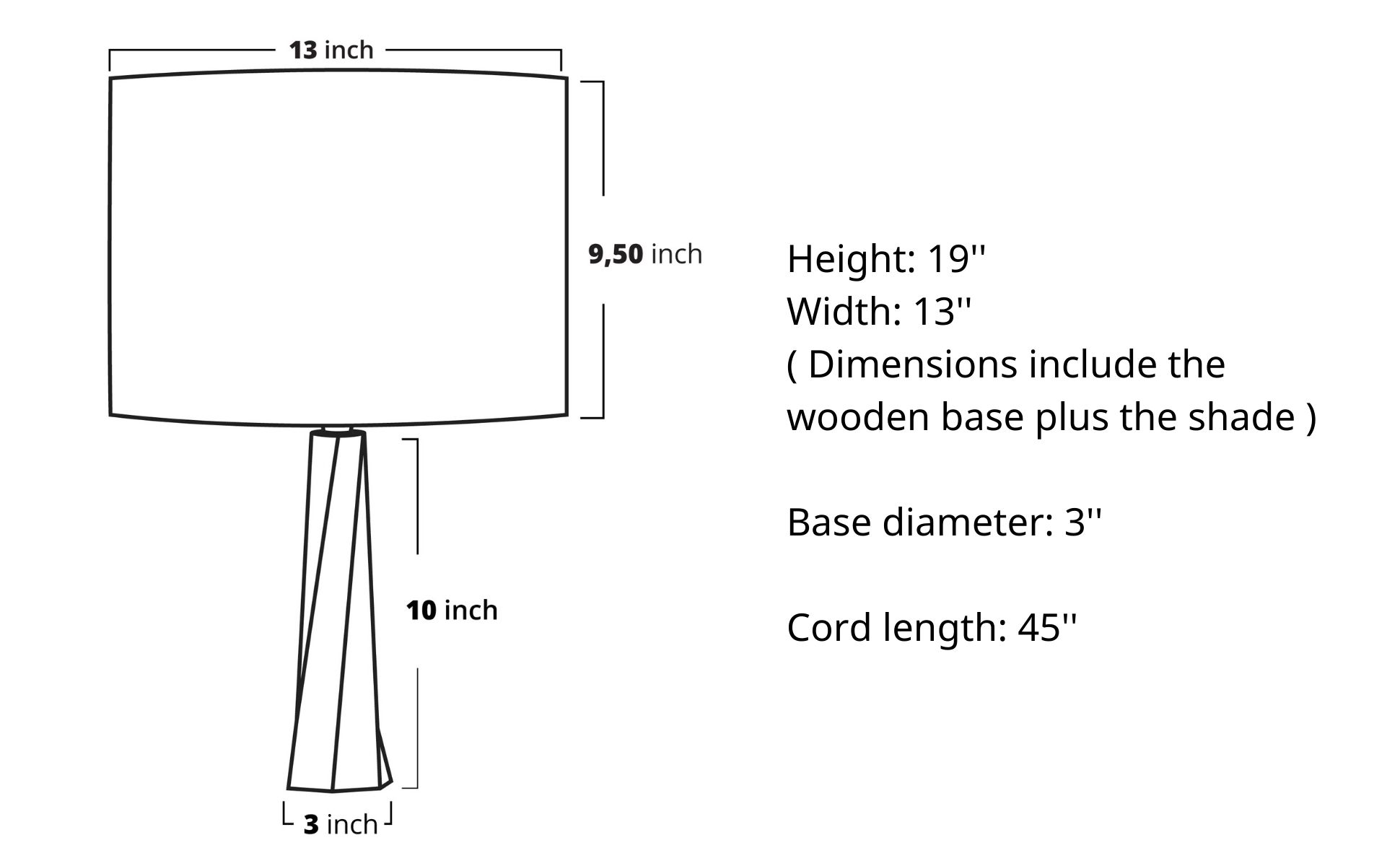 أبعاد المنتج: حامل خشبي = ارتفاع 25 سم (10 بوصات) × عرض القاعدة 7.6 سم (3 بوصات). عاكس الضوء = ارتفاع 24 سم (9.5 بوصة) × عرض 33 سم (13 بوصة). طول السلك = 1.15 م (45 بوصة). حجمه الصغير يجعله مثاليًا كمصباح خشبي بجانب الليل؛ قم بإقرانها مع واحدة أخرى لإنشاء إضاءة بجانب السرير.