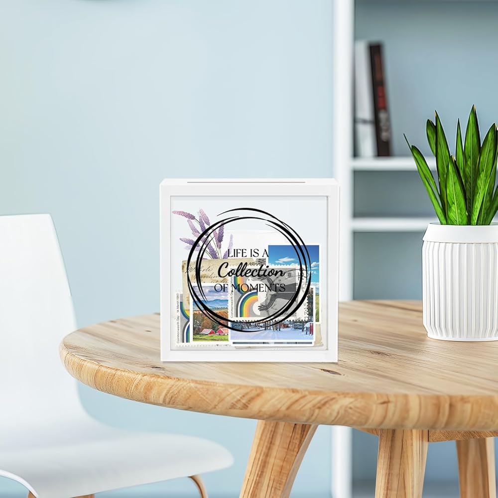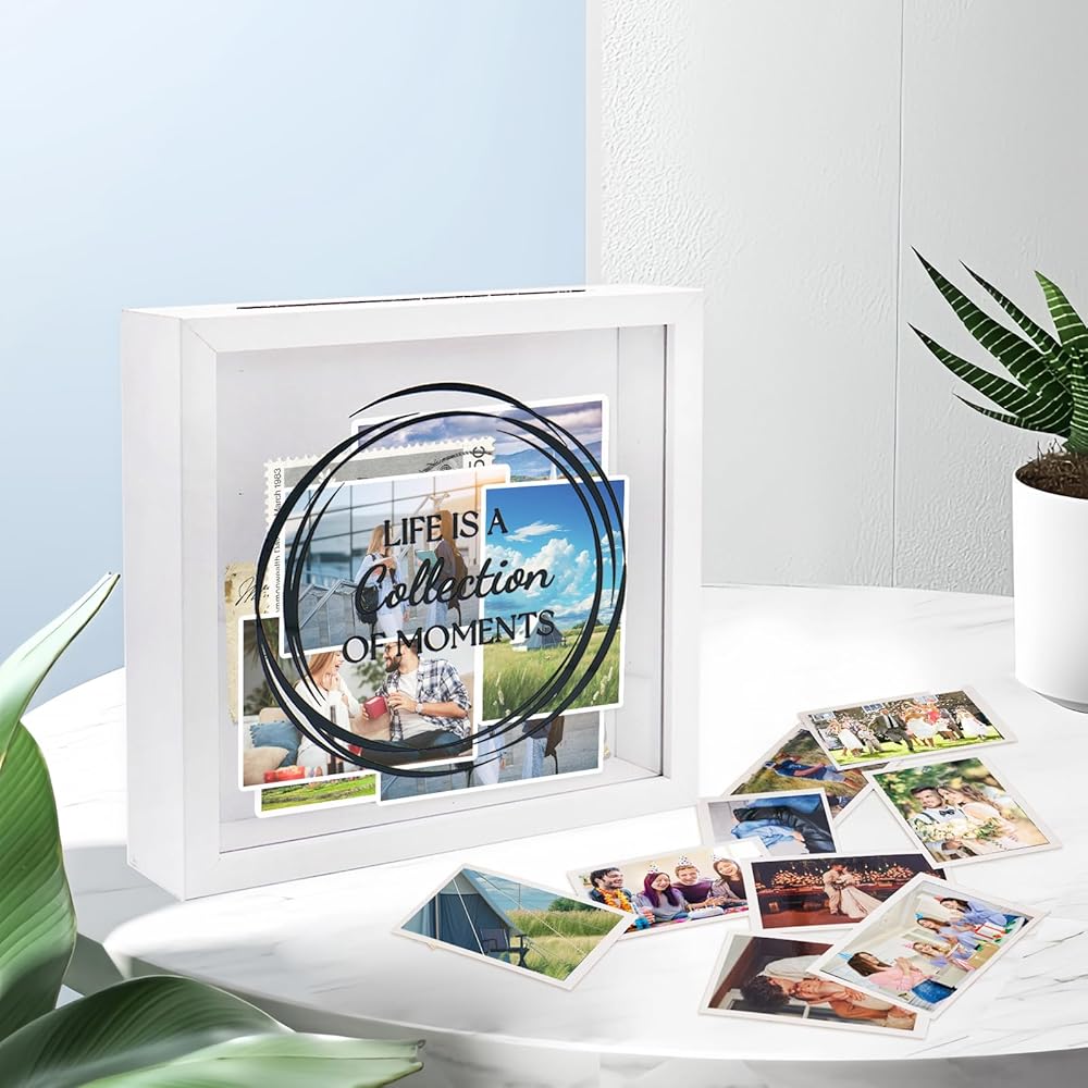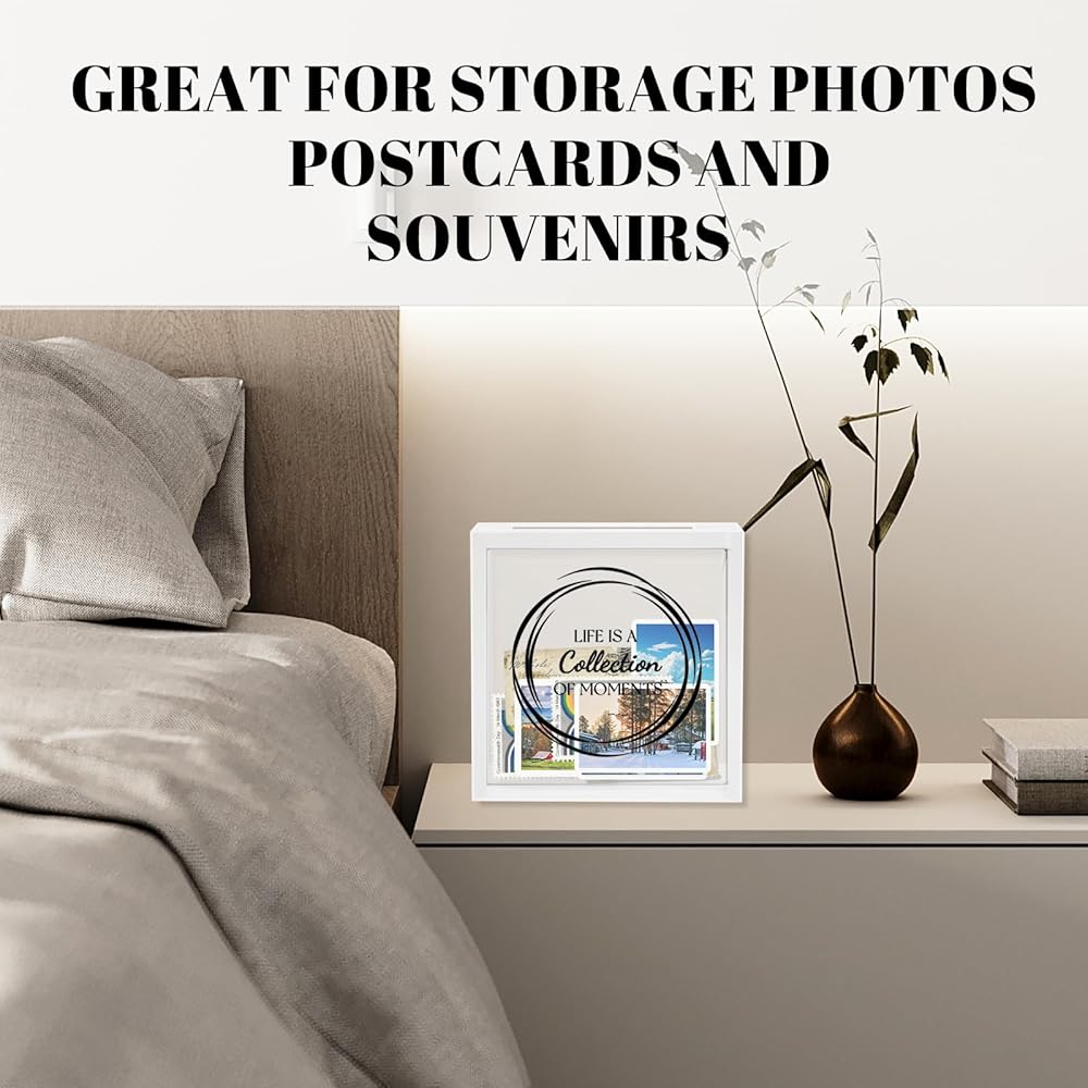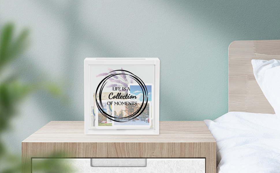 【Photo Storage Box with Slot】Shadow box frame is made of solid wood. The clear, shatterproof acrylic front repels dust, perfectly protecting your keepsakes while displaying them clearly.