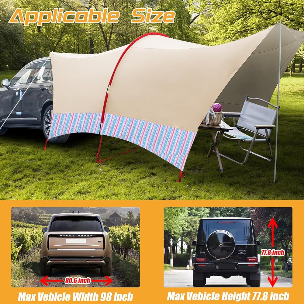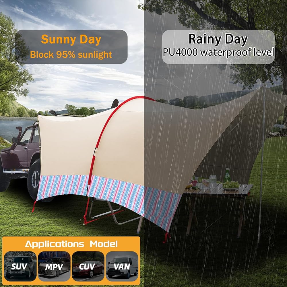 Suitable for most cars:With the retractable elastic cord, it can match most cars and almost all SUVs, whether your car is a full-size SUV or a small mini. The main focus of this canopy is its excellent waterproofing and sun protection properties.