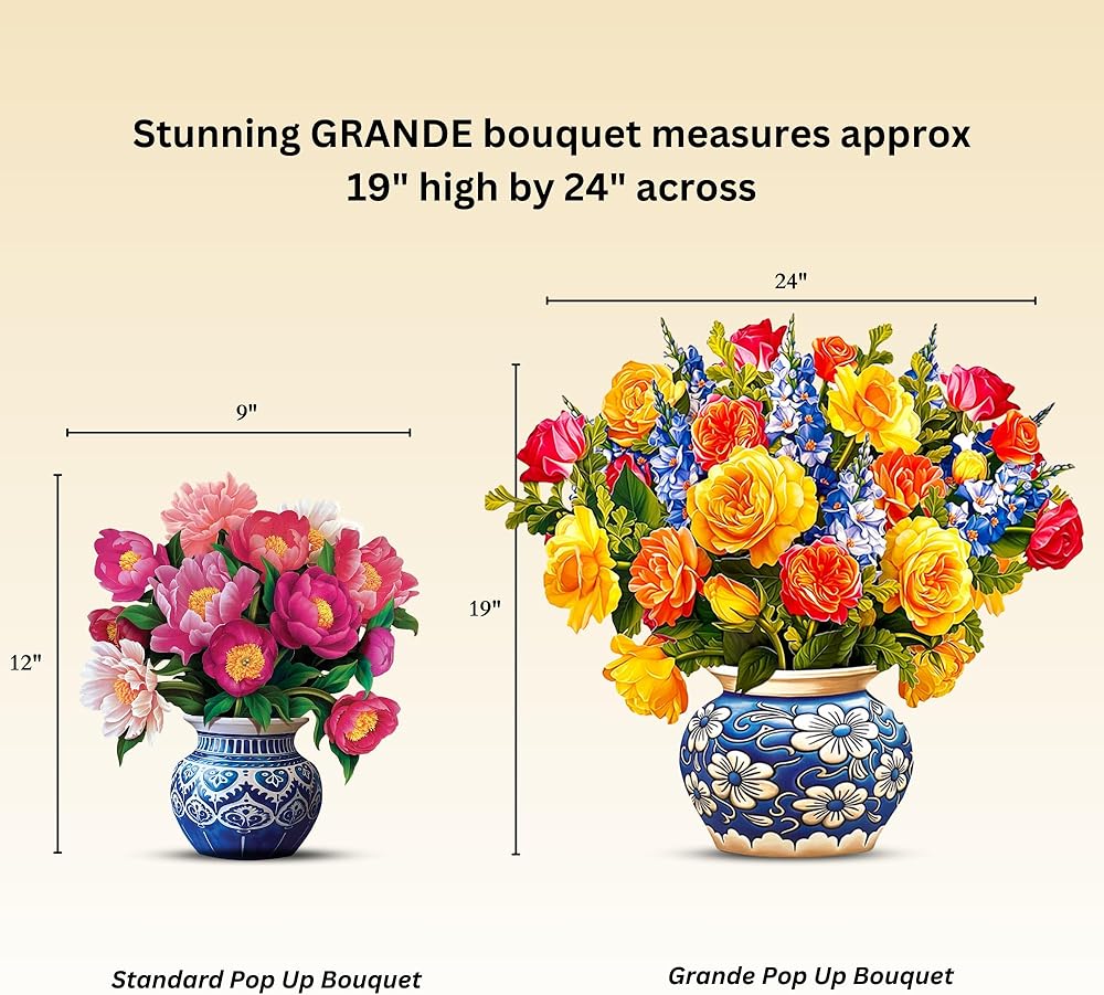 LARGE POP UP CARDS stand 17 inches tall on their own or in in the supplied paper vase. A blank notecard is included for your custom gift message, and an envelope ready to mail flat anywhere in the USA.