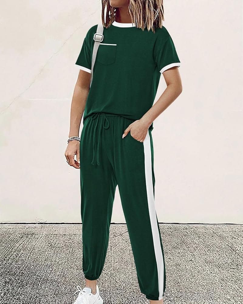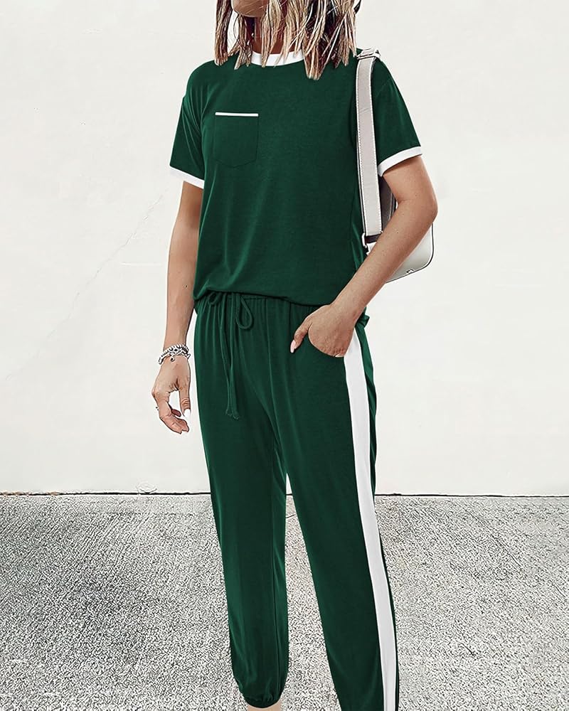 Fashion Two Piece Set: This Two Piece Jogger Set Includes A Comfy Crewneck Short Sleeve Tops And A High Waist Long Pants With Side Pockets. Feature A Simply Color Block And Basic Design. Short Sleeve Pullover Tops With Front Pockets Design. The Adjustable Drawstring Waist Can Provide You With Maximum Comfort.