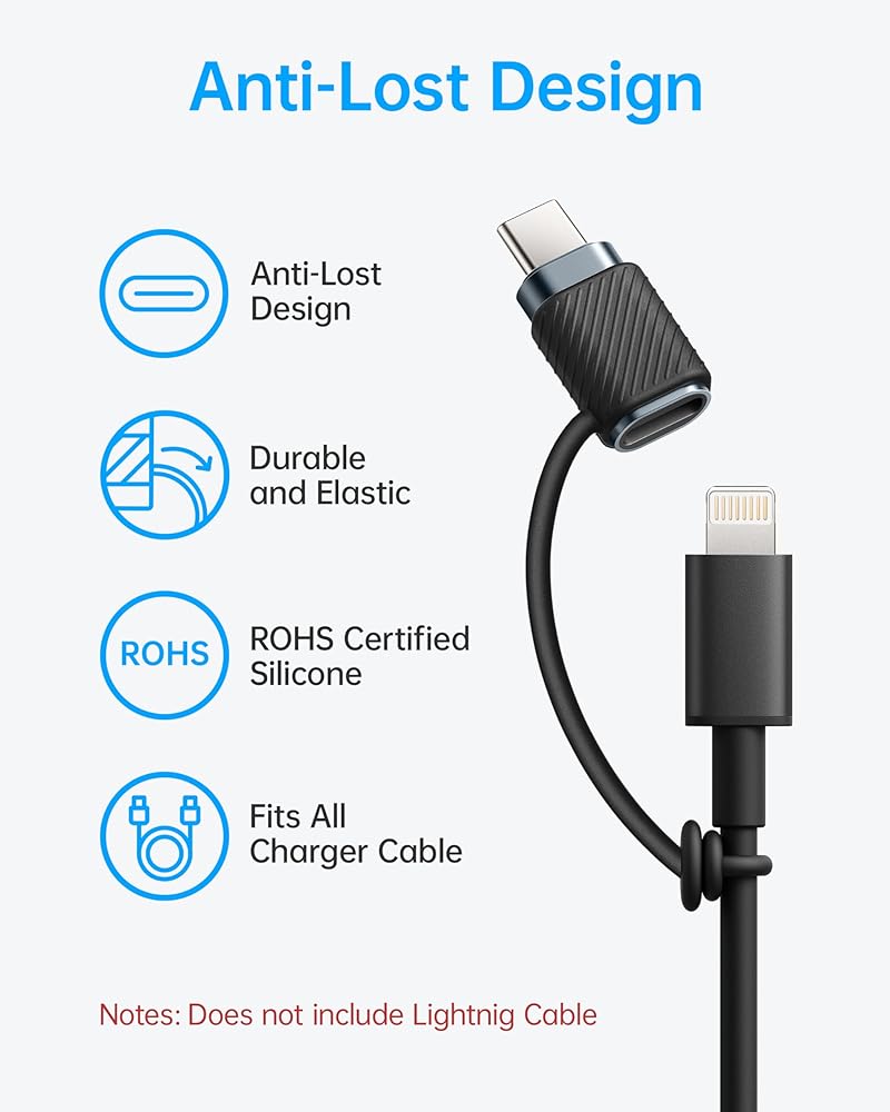 ✅【Plug and Play】2pcs USB-C to Lightning adapters and 2pcs anti-lost holders are perfectly matched, each USB C to iPhone adapter comes with an anti loss cable for easy storage and portability. Whether you are at home, in the office, in the car, or traveling, it is an ideal adapter or substitute. They're very useful for if you have multiple devices but don't want a million cords.